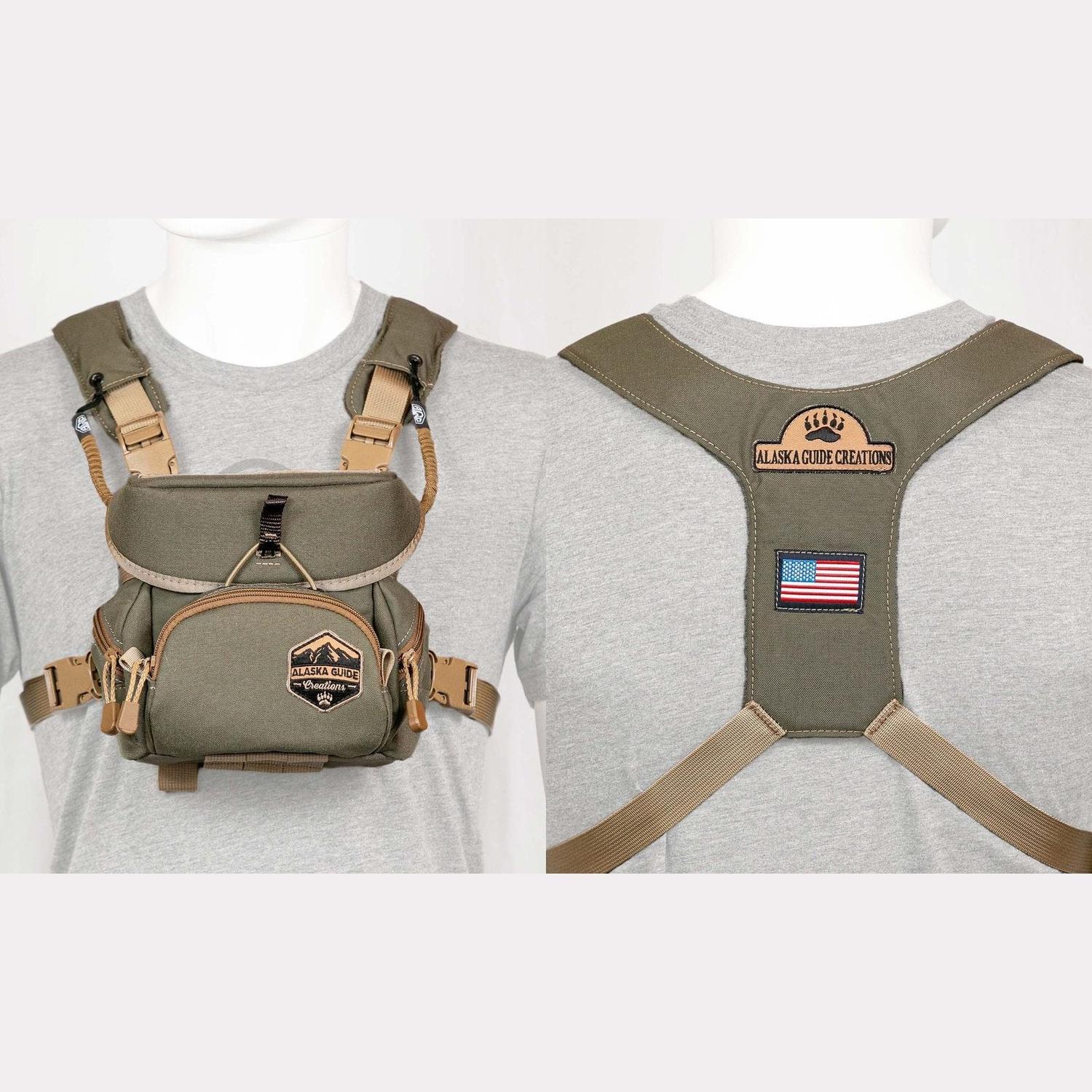 The Alaska Classic – Gen L represents the evolution of the original chest pack that started it all. Built on more than 40 years of Alaskan guiding experience, this updated version preserves the iconic layout that made Alaska Guide Creations the standard in bino harness systems while adding key refinements for today’s professionals. Featuring the new Gen L Harness, Pro Tethers, and bottom-mounted MOLLE webbing, the Classic delivers rugged dependability with modern comfort and function.