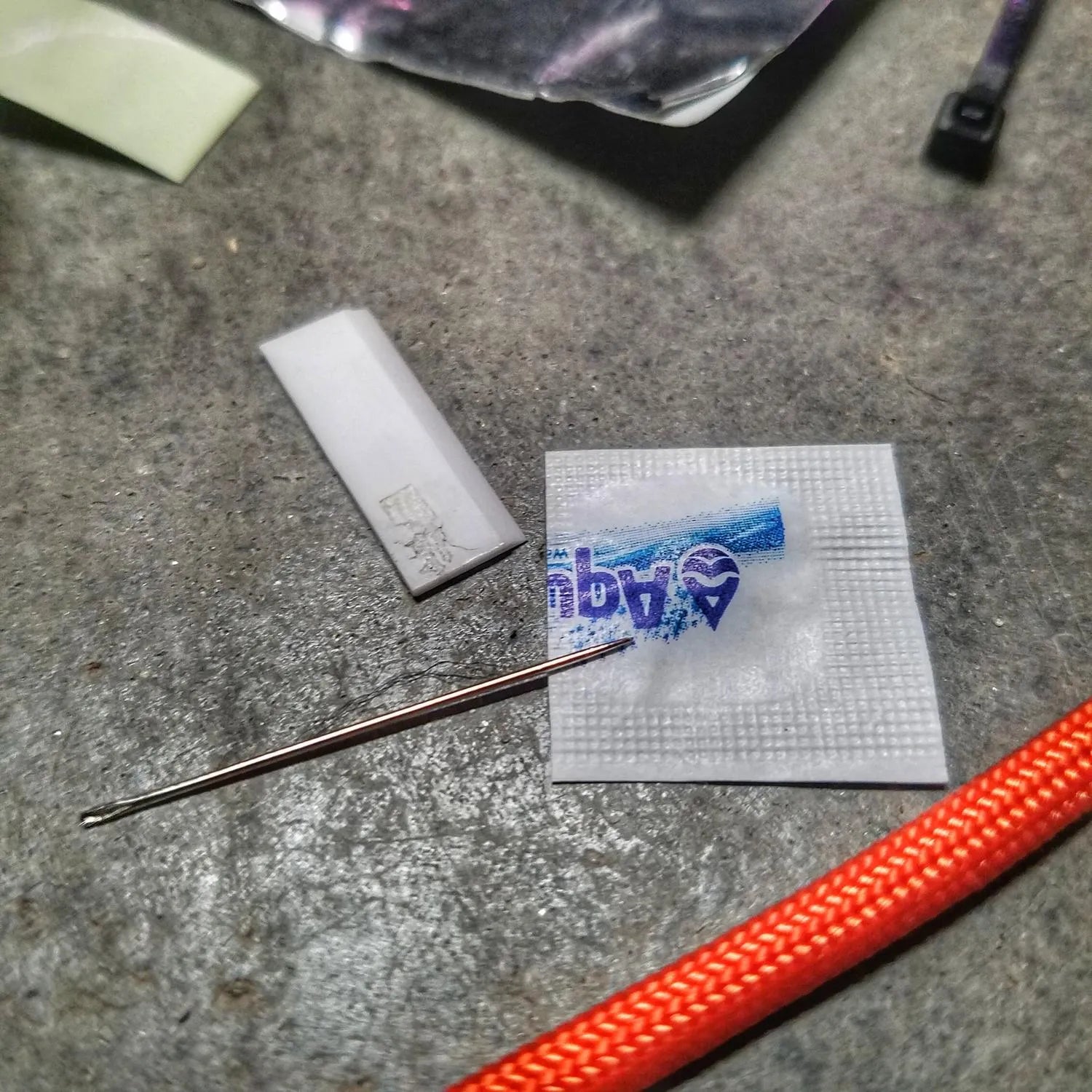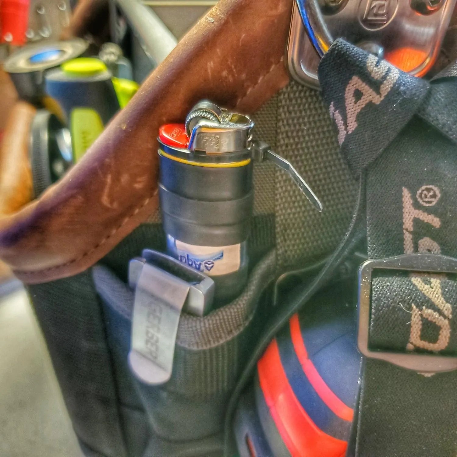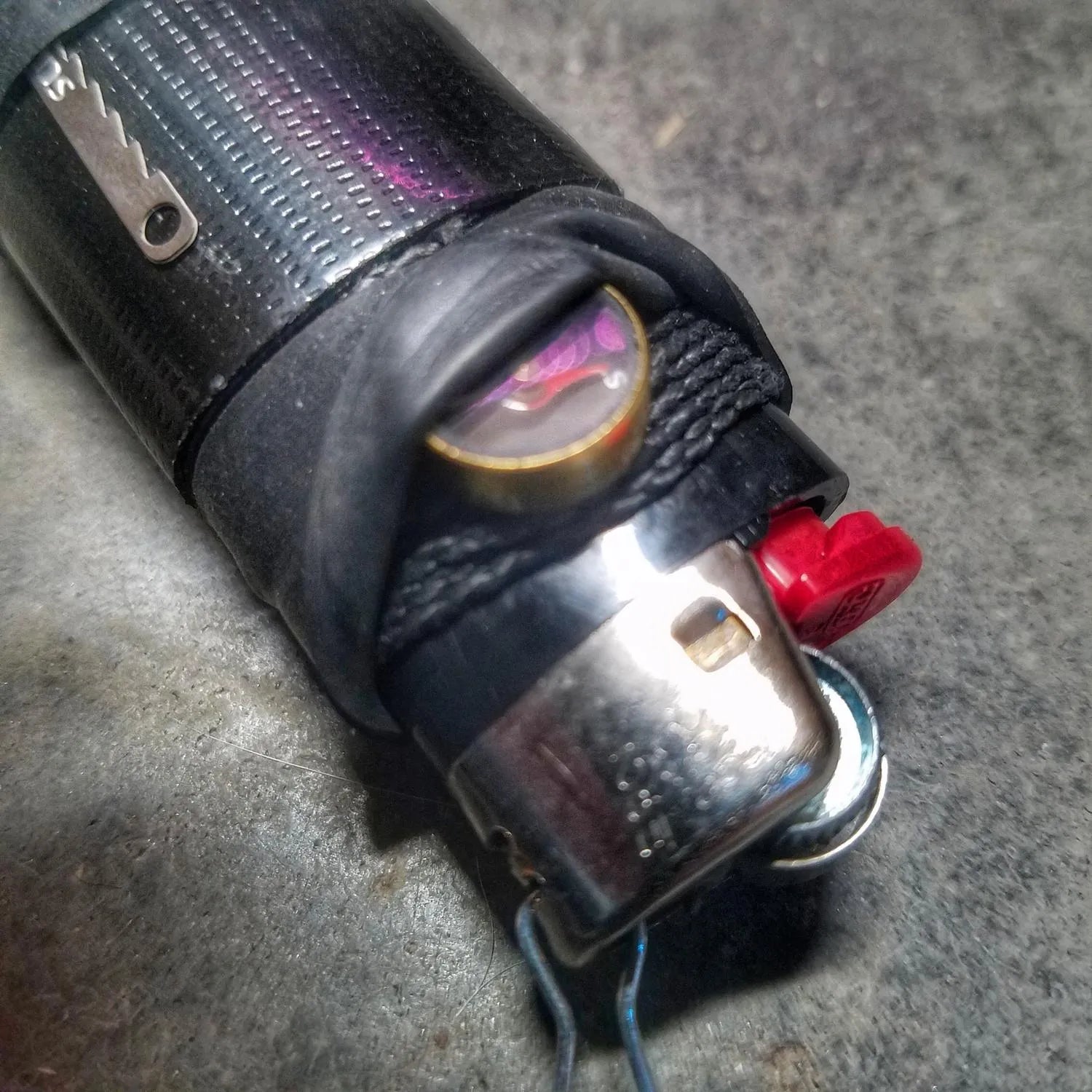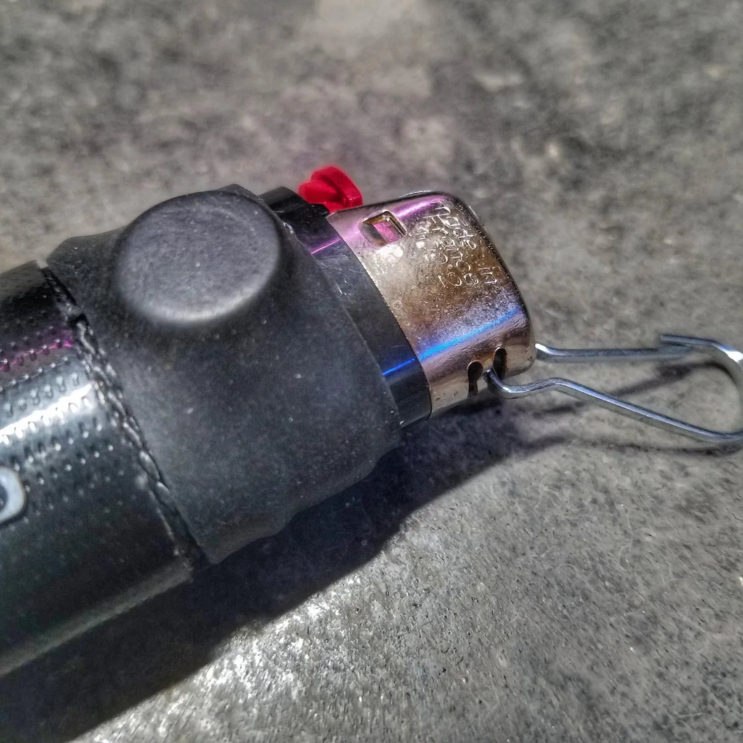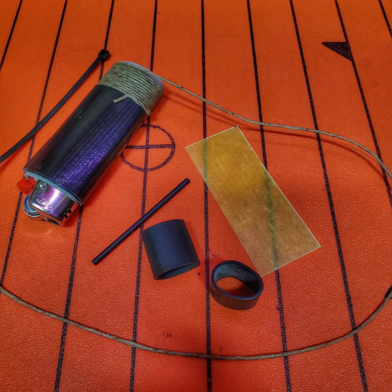 Use ranger bands to secure items, adhesive for tapes/mirrors, and wrap cordage around the lighter body.