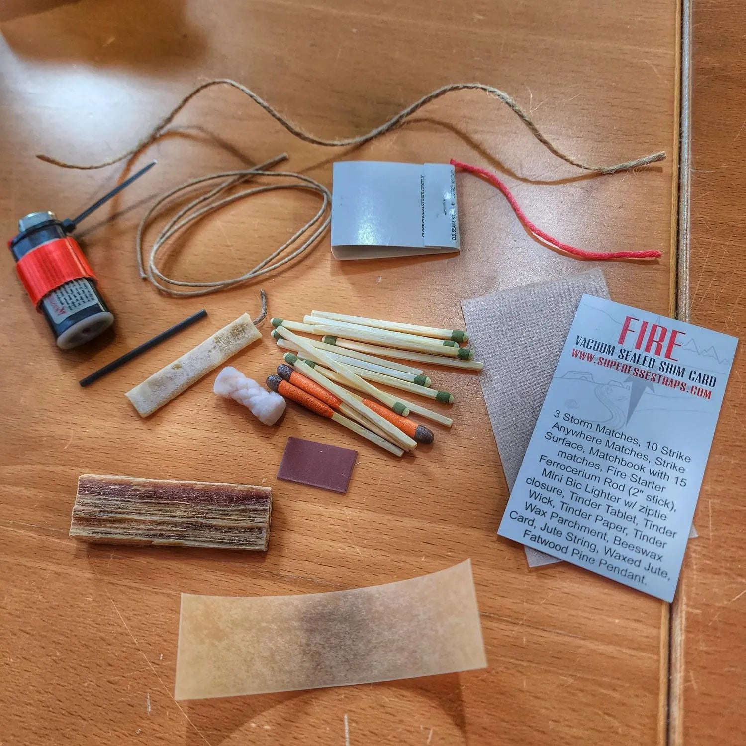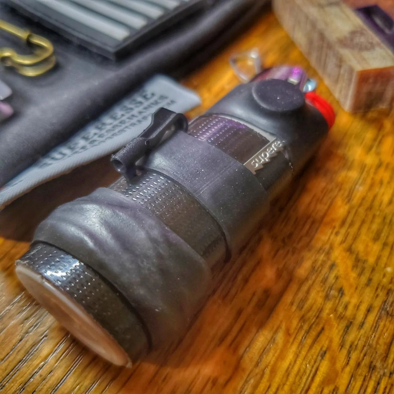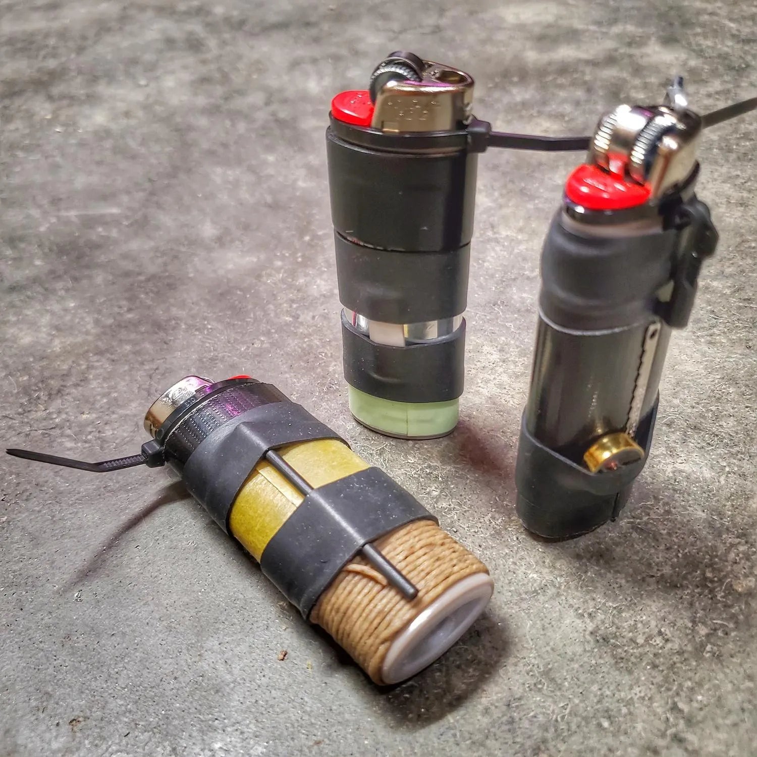 The Lighter + Kit transforms a standard Bic lighter into a compact survival system. Each kit includes essential tools that secure to the lighter body with ranger bands or adhesive surfaces, giving you fire, navigation, escape, and survival options in your pocket.