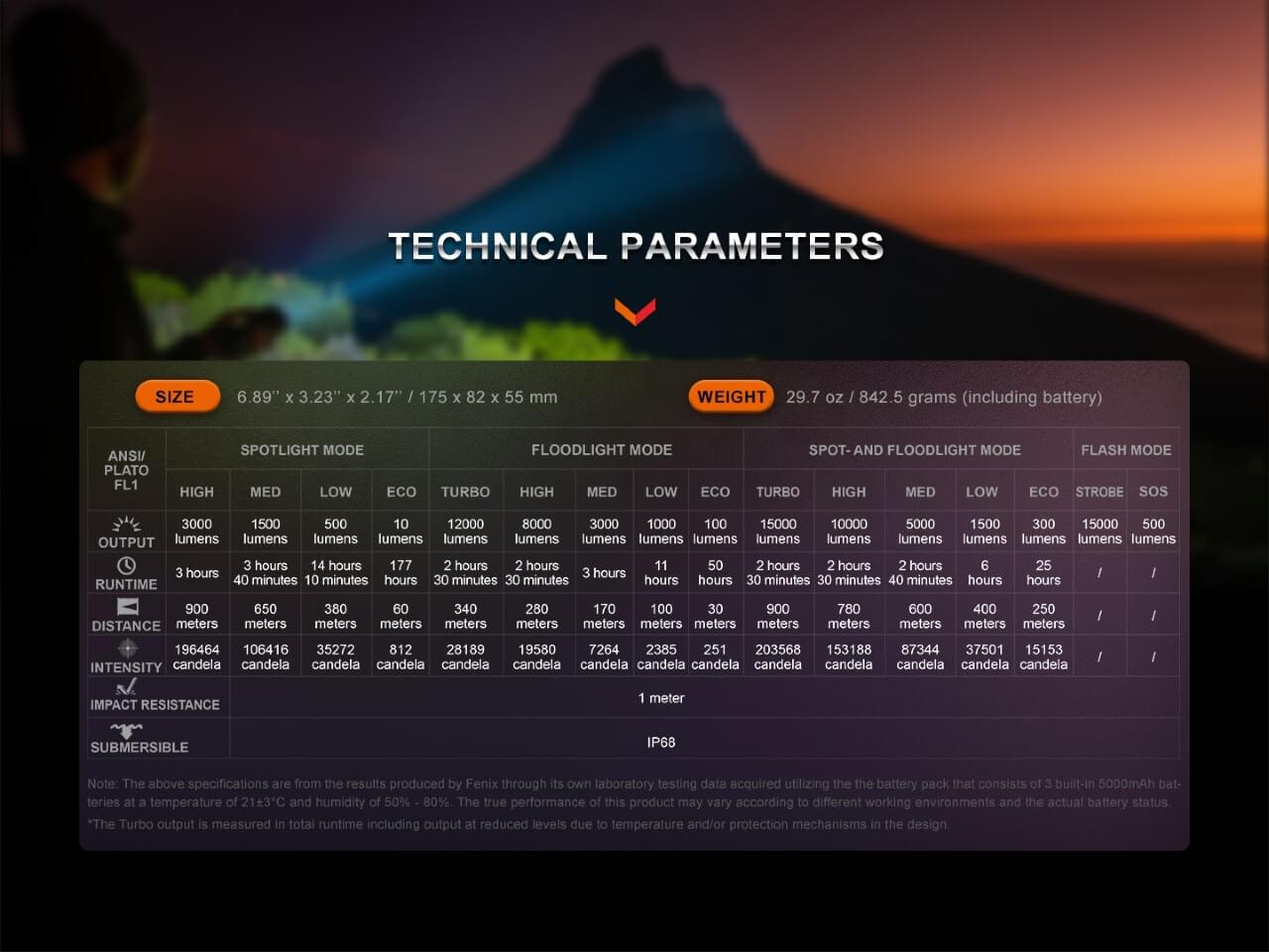 • Modes: 4 spotlight levels, 5 floodlight levels, 5 combo levels, strobe, SOS