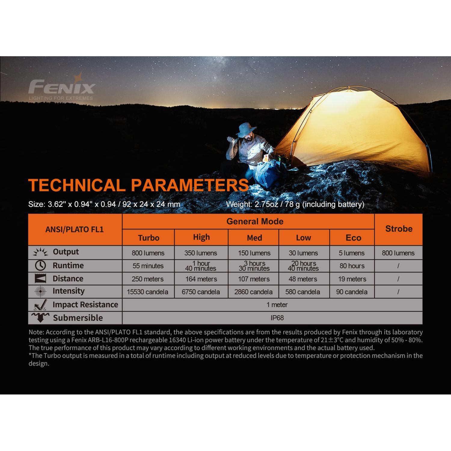 Battery: 16340 Li-ion rechargeable (included) or 1x CR123A