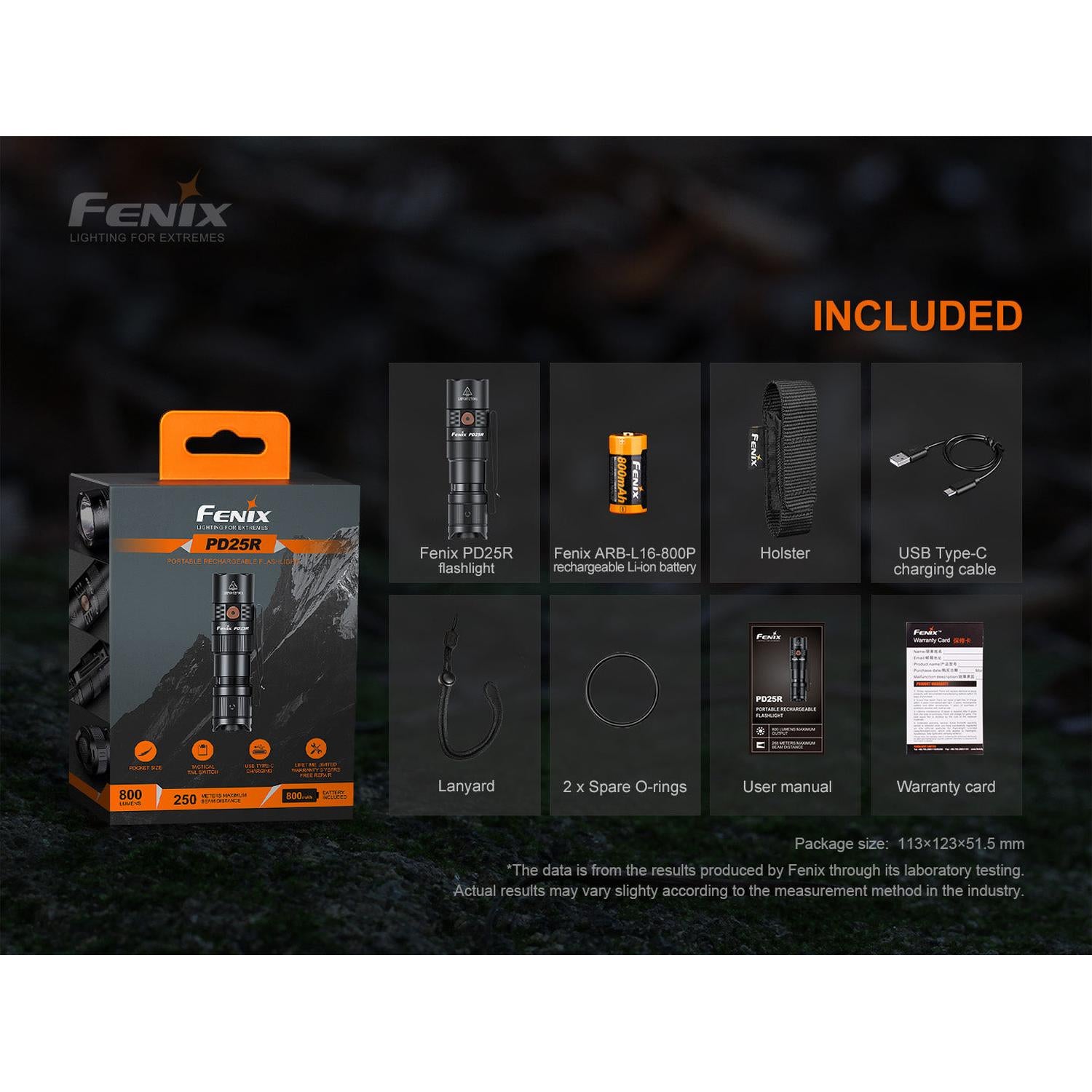 Included: PD25R flashlight, 16340 battery, USB Type-C cable, lanyard, holster, spare O-ring, user manual, warranty card