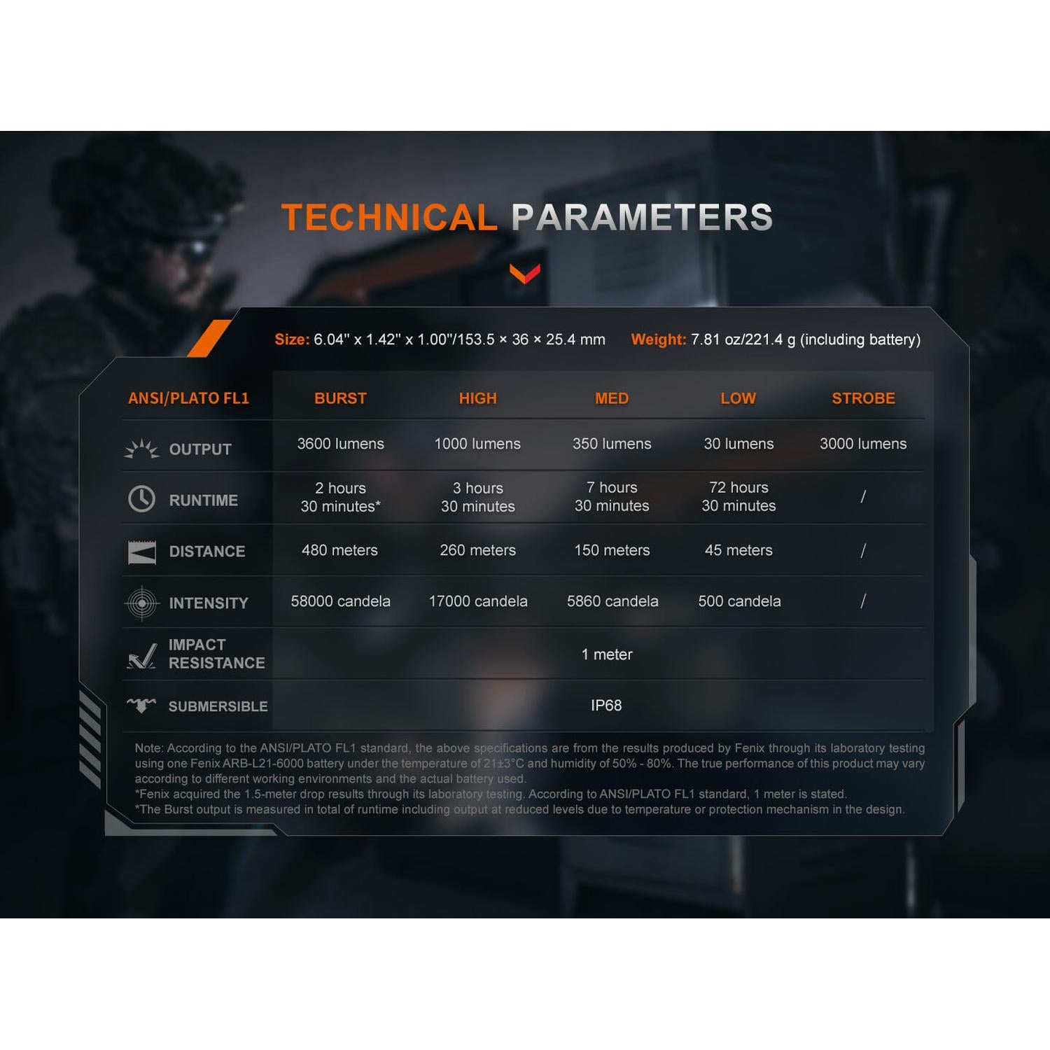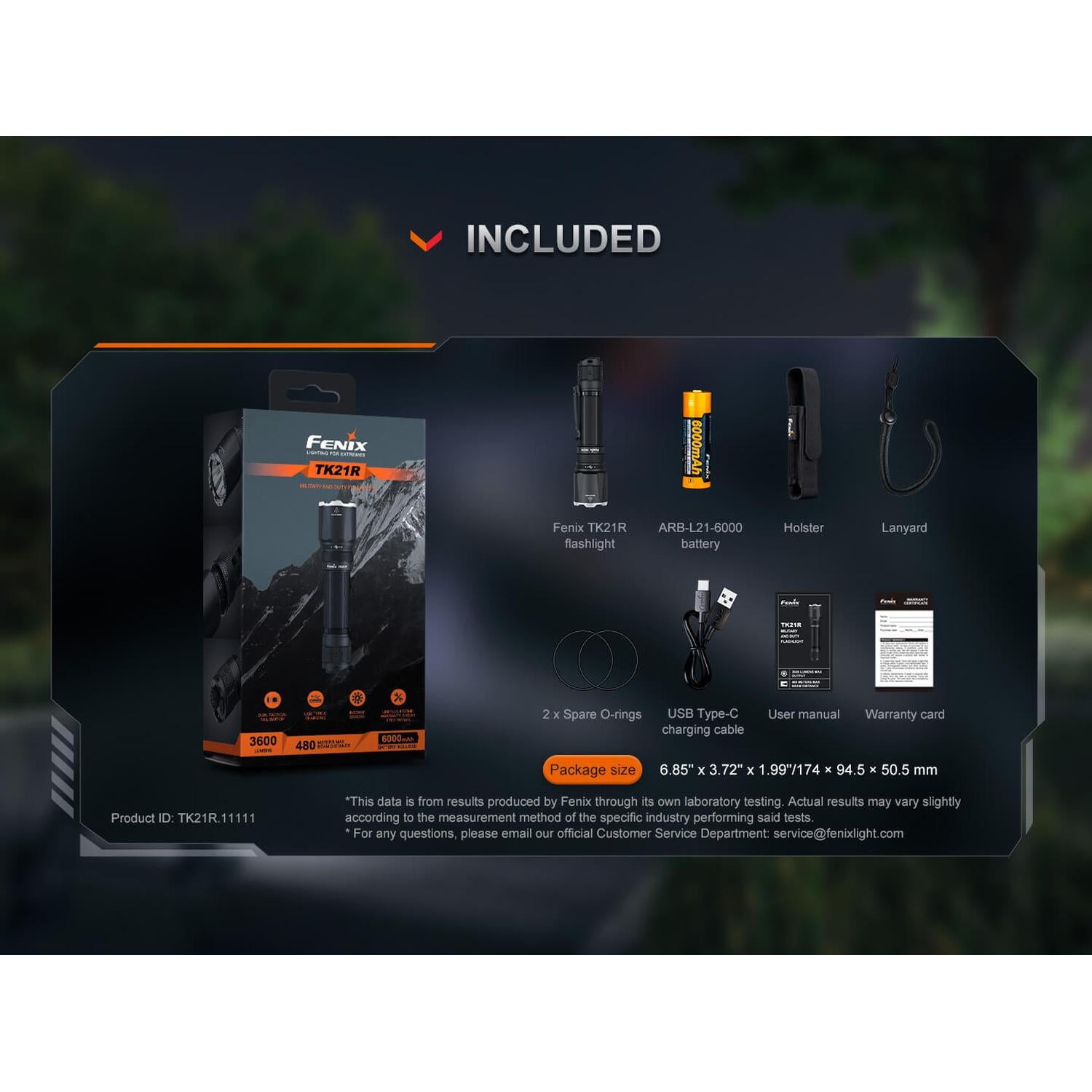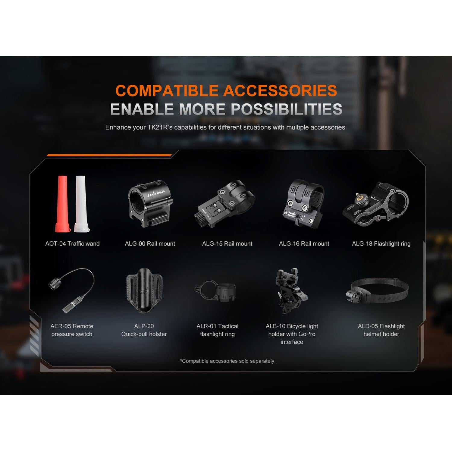 The Fenix TK21R delivers 3600 lumens of powerful illumination and a 480-meter beam distance, making it a trusted tool for law enforcement, military, and duty professionals. Powered by a Luminus SFT90 LED and Fenix’s Advanced Pulse-Frequency (APF) Transmission System, it provides unmatched beam stability, consistent performance, and tactical reliability in the field.