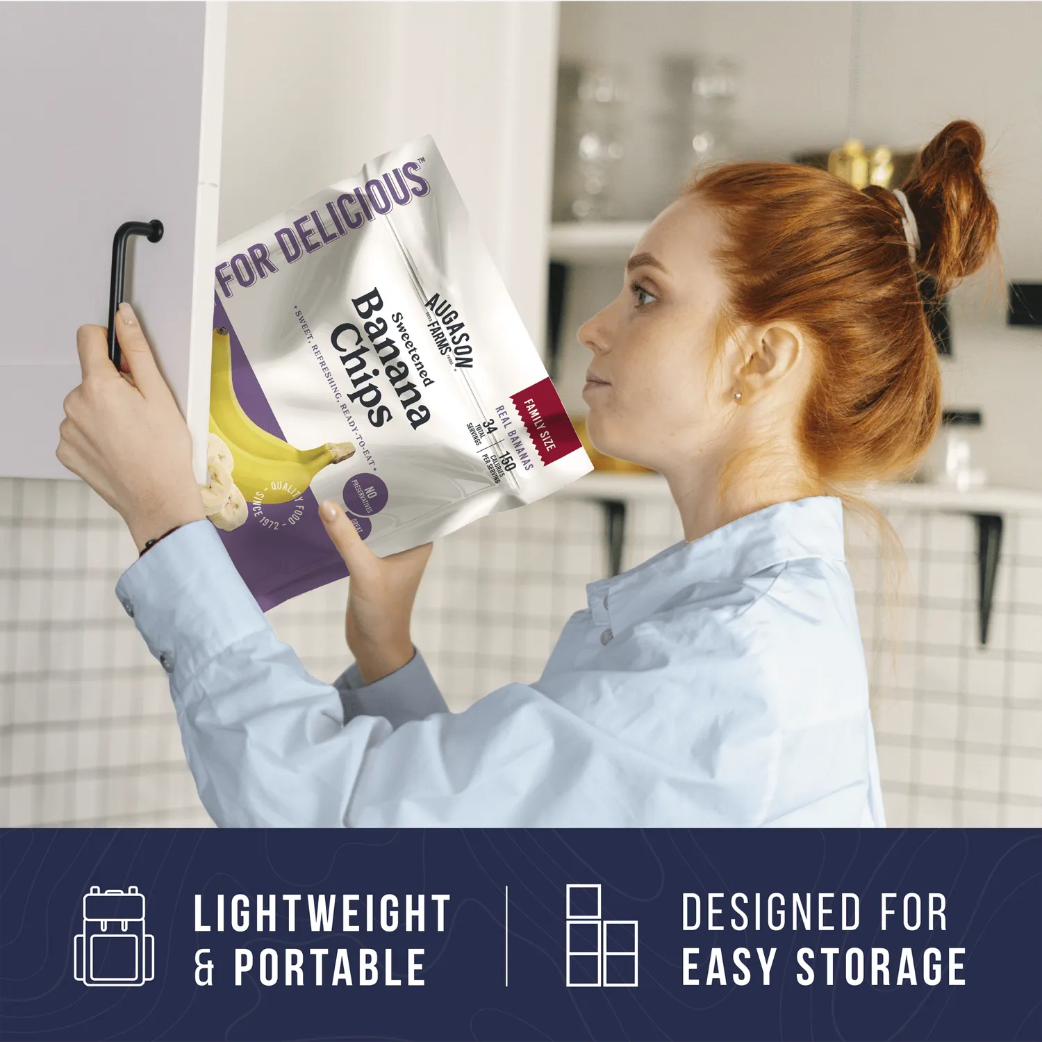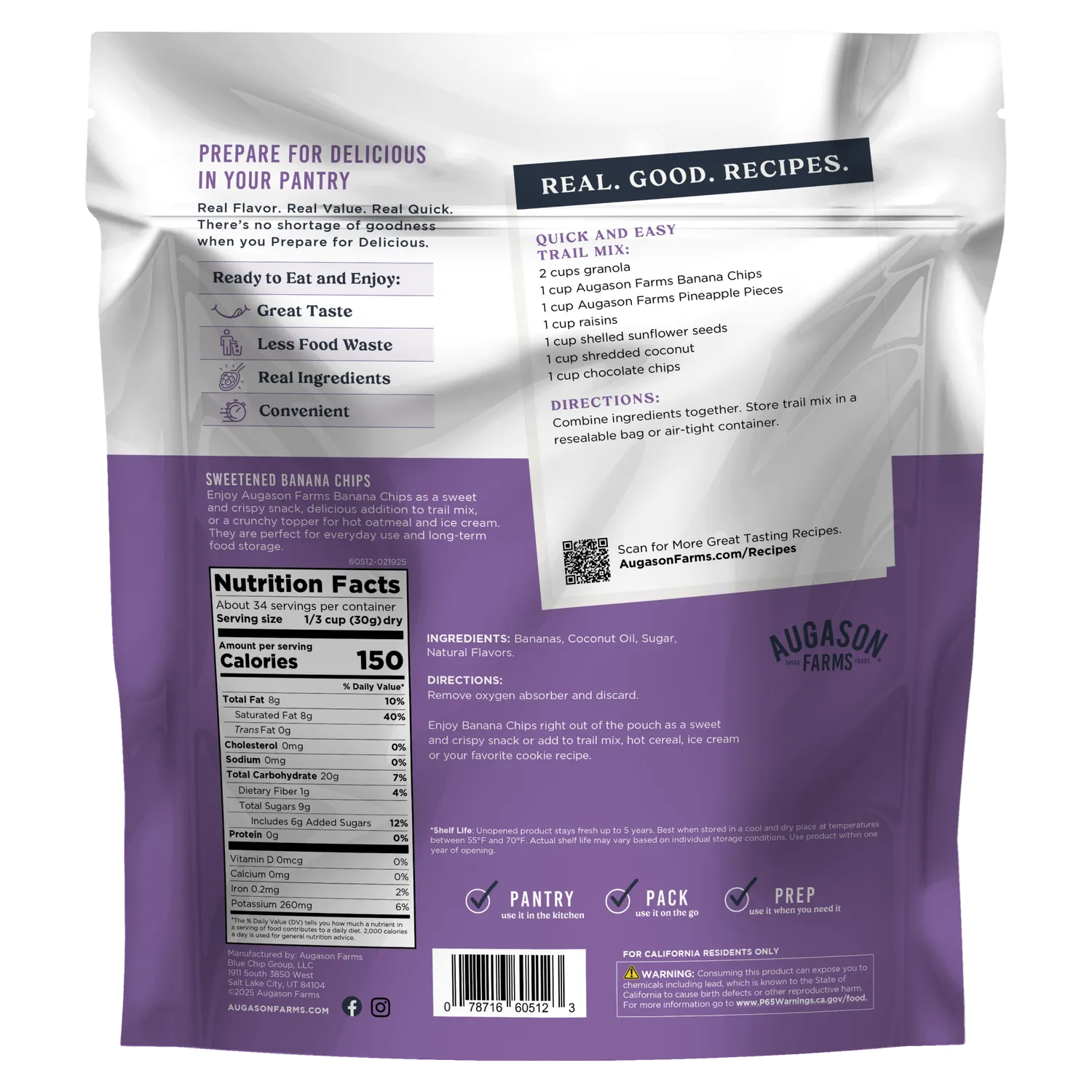 Enjoy Augason Farms Banana Chips as a sweet and crispy snack, delicious addition to trail mix, or a crunchy topper for hot oatmeal and ice cream. They are perfect for everyday use and long-term food storage.