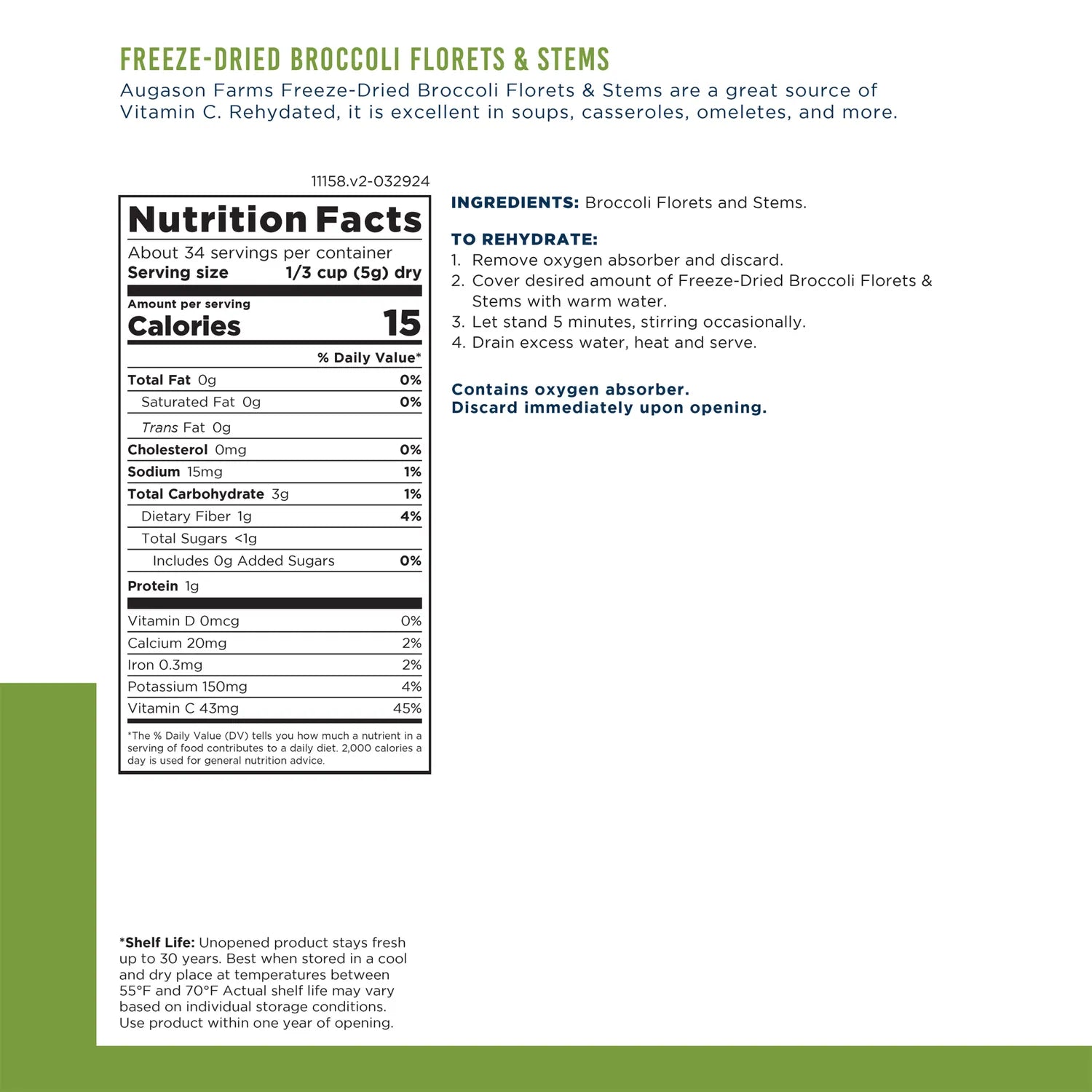 Augason Farms Freeze-Dried Broccoli makes it easy to add vegetables to your meals—no washing, chopping, or waste. Simply rehydrate and toss into soups, casseroles, omelets, and more. It’s a good source of vitamin C and perfect for both everyday cooking and long-term emergency food storage. Shelf-stable and ready when you are. No prep. No mess. Just real, nutritious broccoli.