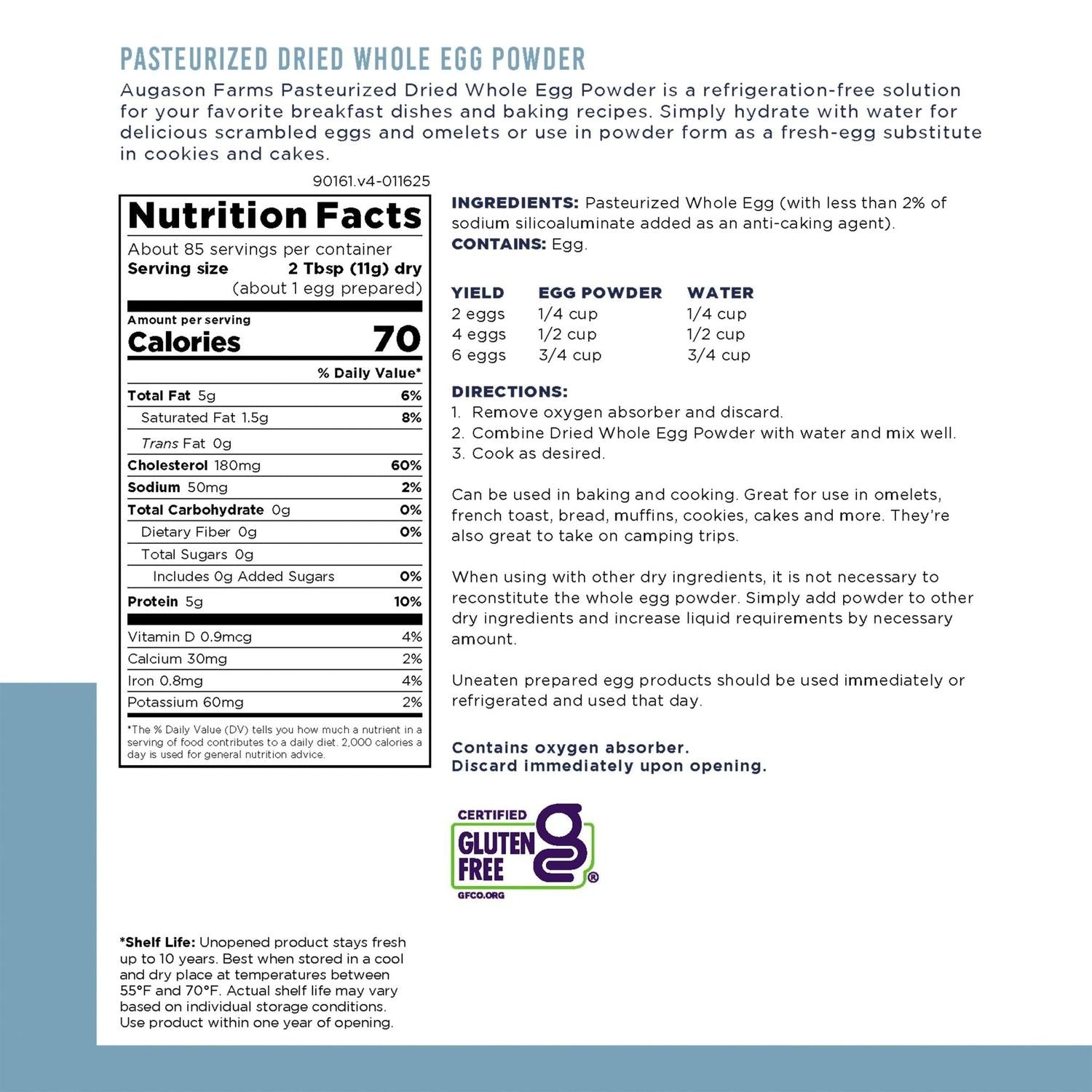 Made from 100% natural egg whites and yolks, Augason Farms dried whole egg powder is ideal for baking and cooking. Hydrate with water for scrambled eggs and omelets or use the powder form for a refrigeration-free substitute in baking recipes.