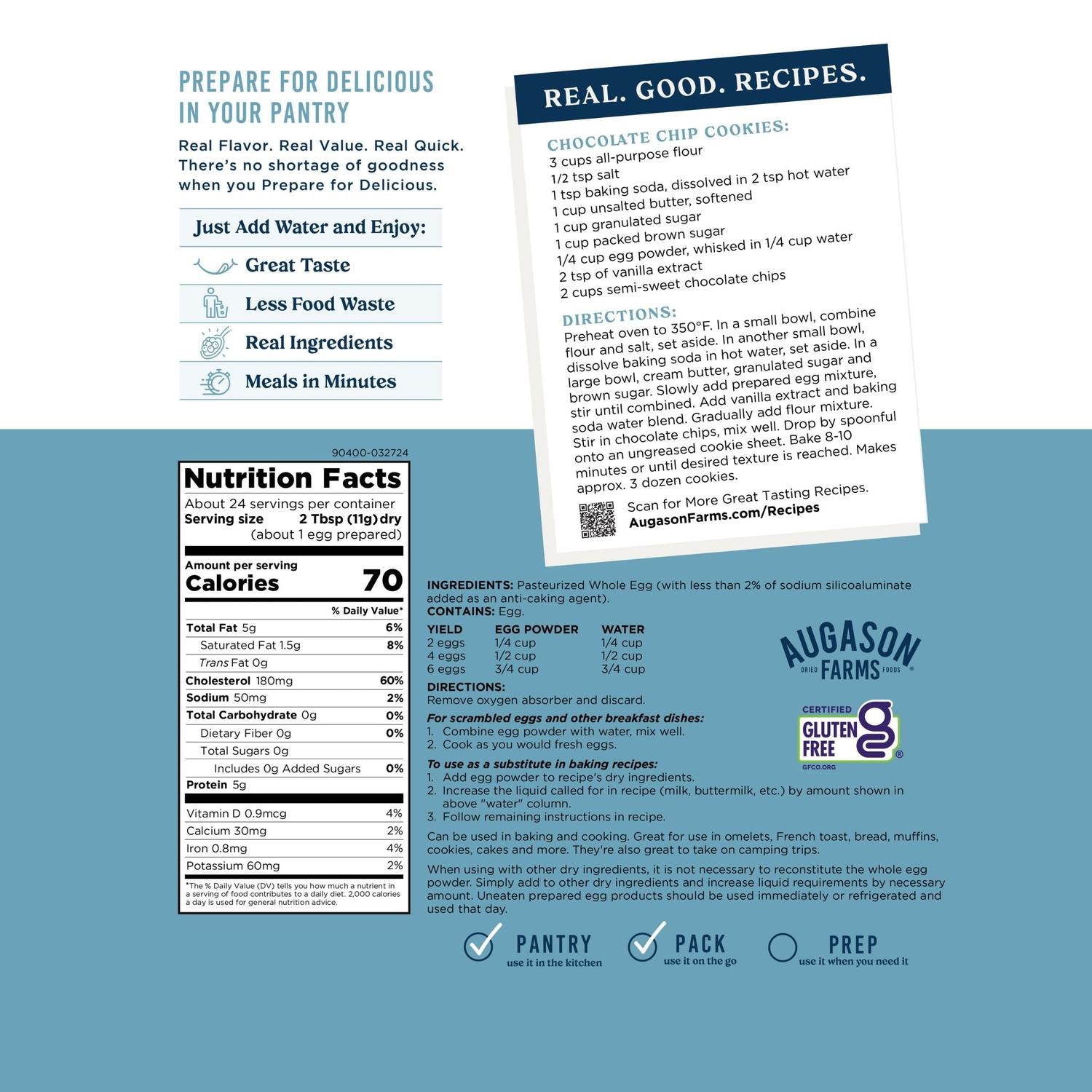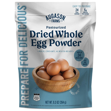 Made from 100% natural egg whites and yolks, Augason Farms dried whole egg powder is ideal for baking and cooking. Hydrate with water for scrambled eggs and omelets or use the powder form for a refrigeration-free substitute in baking recipes.
