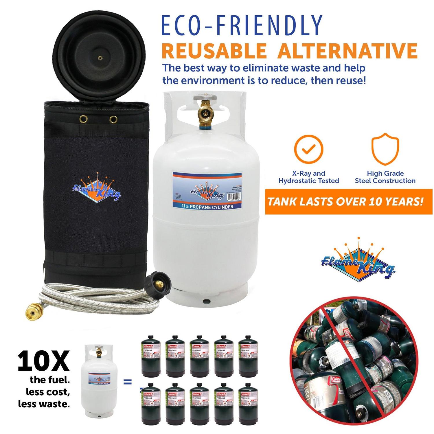 The Flame King GH10-SSH-10LB bundle equips you with everything needed for safe, portable propane use: a 10 lb refillable tank, a 5 ft steel braided adapter hose, and the Flame King Gas Hauler protective case. Built for convenience and safety, this setup is ideal for camping, RVing, fishing, or tailgating. DOT and Transport Canada certified, it’s designed to keep your fuel secure and your gear powered wherever you go.