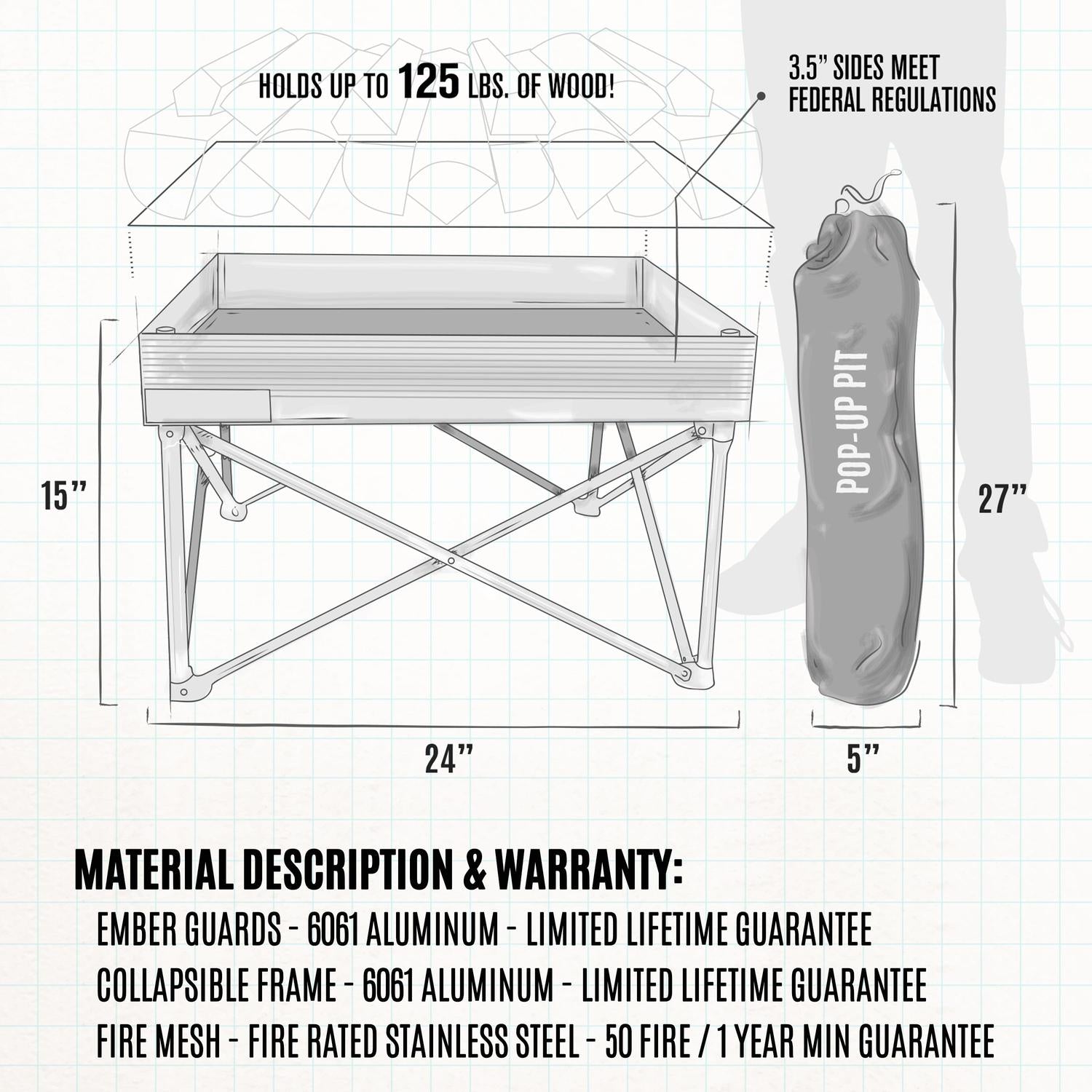 • Large Burn Area – Full 24" × 24" surface holds up to 125 lbs of firewood for group-size campfires