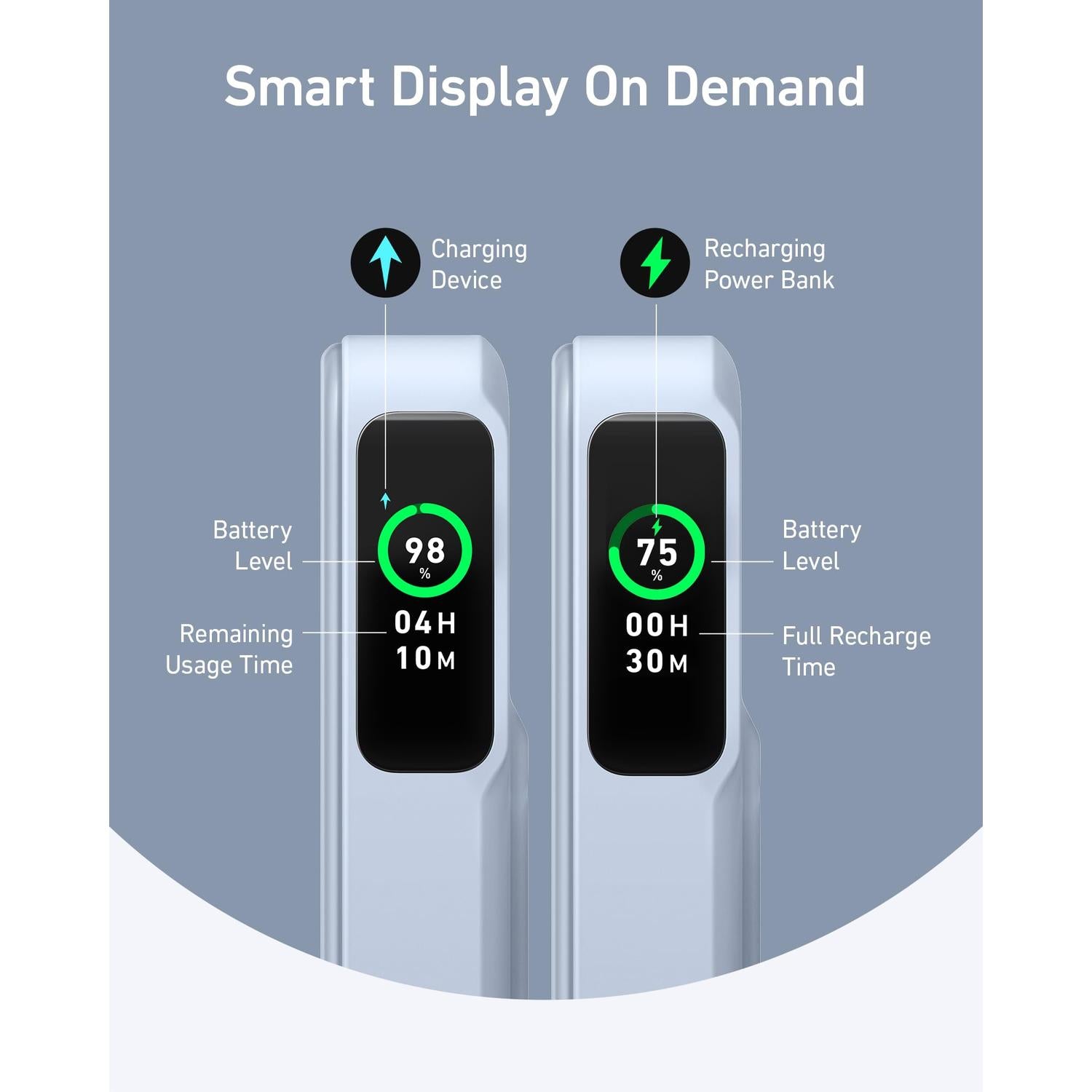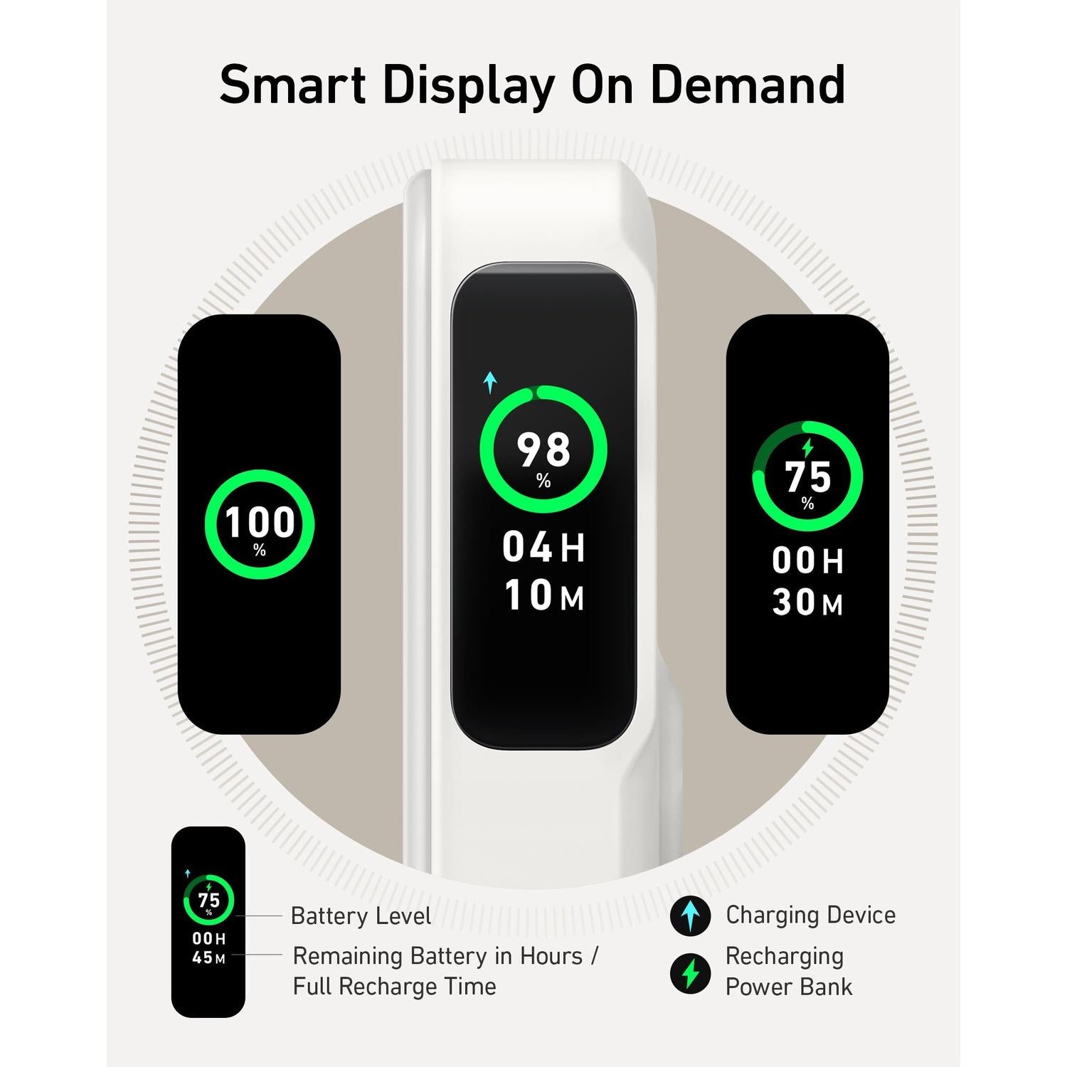 • Smart display shows battery percentage and recharge timing