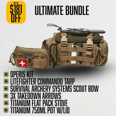 Includes: OPERIS Kit + Knife & Dirk Sheath, LiteFighter Commando Field Tarp, SAS Recon Folding Survival Bow (3 Arrows), Flat-Pack Titanium Stove, Titanium 750 ml Pot w/ Lid