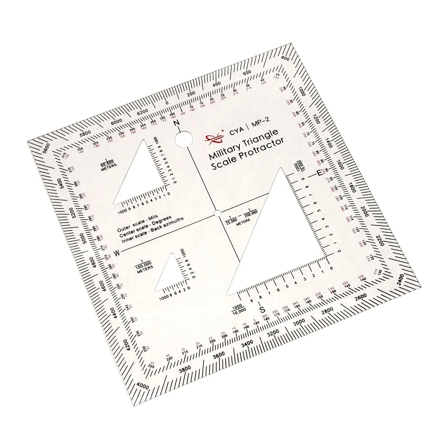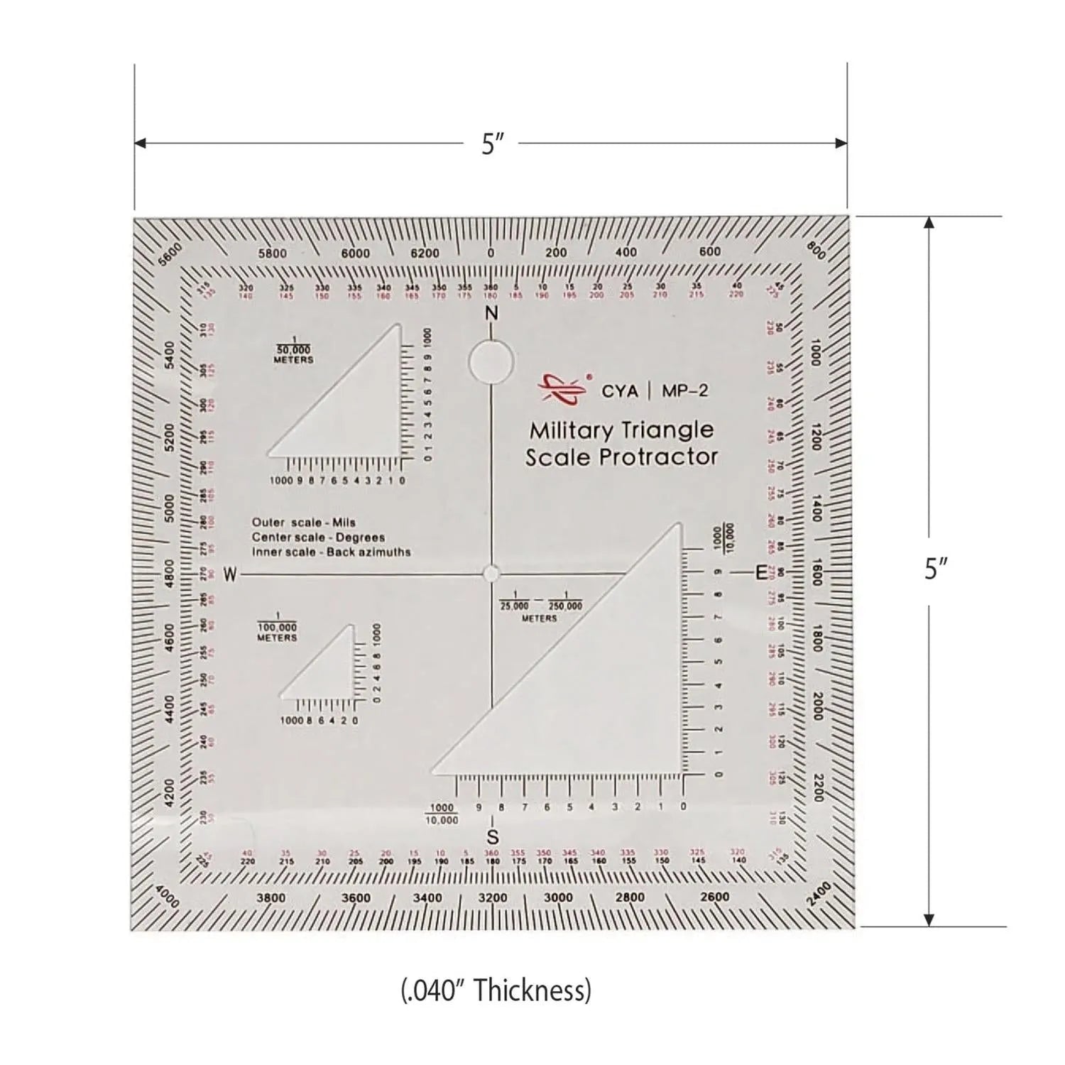 The Square MP-2 Map Protractor is a precision navigation tool equivalent to the Graphic Training Aid 5-2-12 (GTA 5-2-12) used by U.S. and NATO forces. Designed for serious field use, this protractor supports multiple metric-based coordinate systems—UTM, MGRS, USNG—and includes map scales from 1:10,000 to 1:250,000, making it essential gear for military personnel, survivalists, and land navigation students.