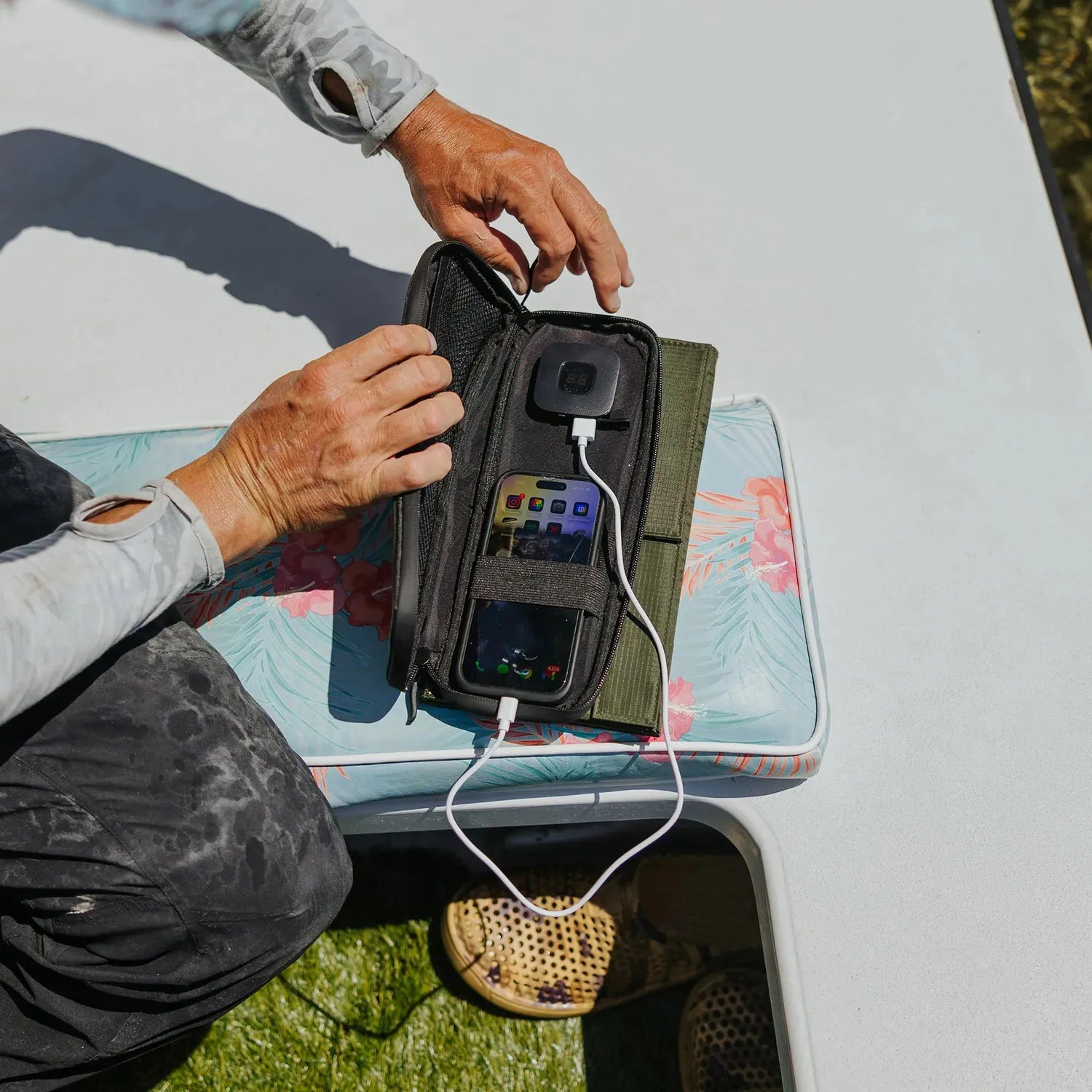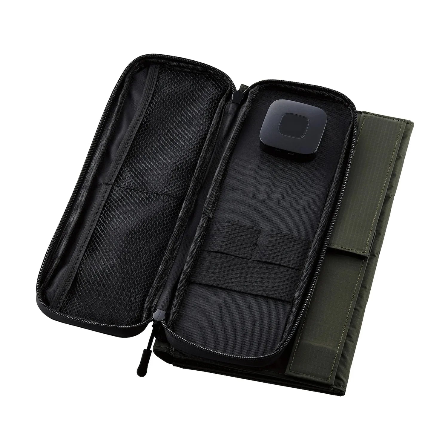 Integrated pouch holds batteries and cables securely while charging.