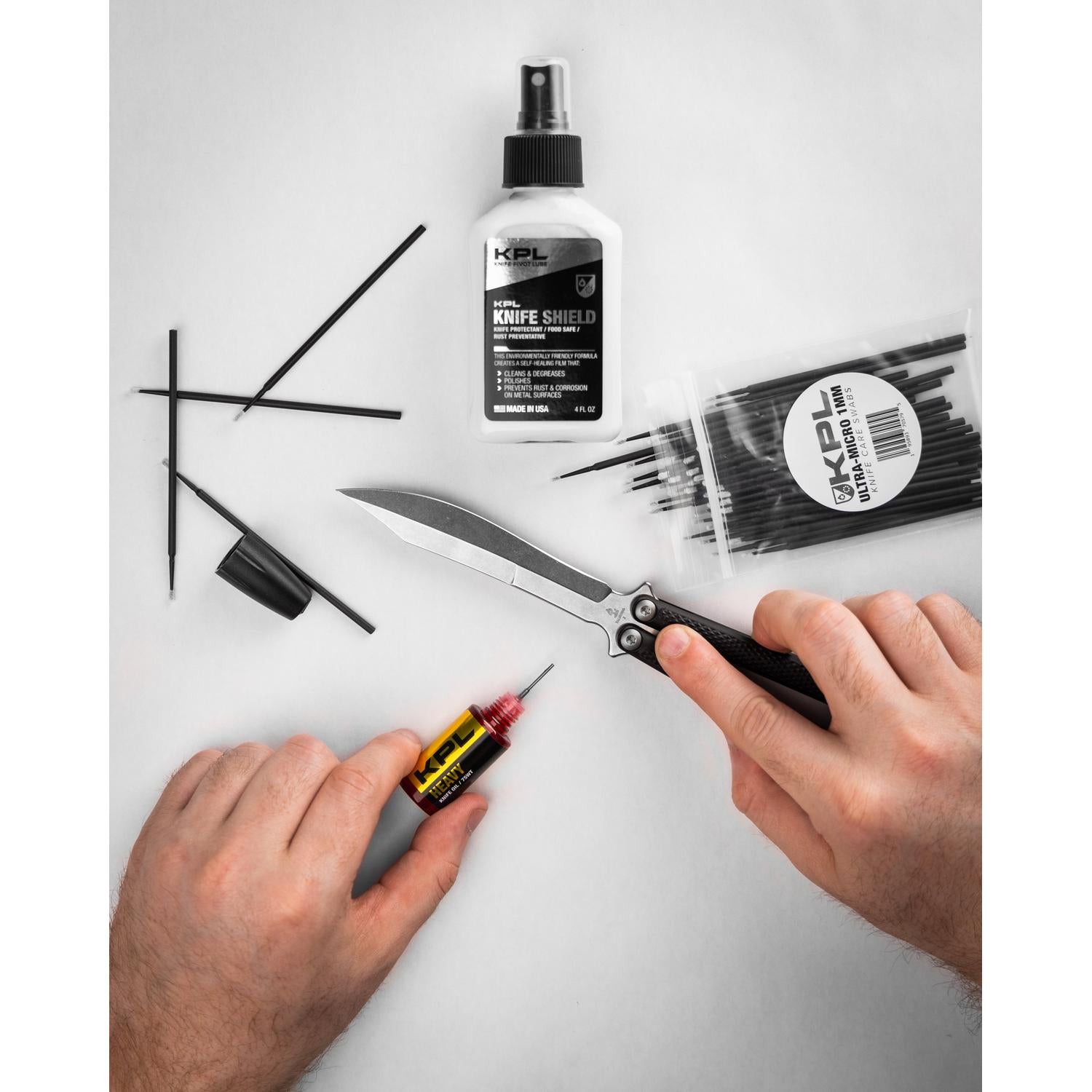The KPL Balisong Bundle is a compact maintenance kit designed for the unique demands of butterfly knives and heavy-blade folders. With rust prevention, heavy-weight pivot lube, and precision cleaning tools, this bundle keeps your balisongs flipping smooth, protected from wear, and free of debris.