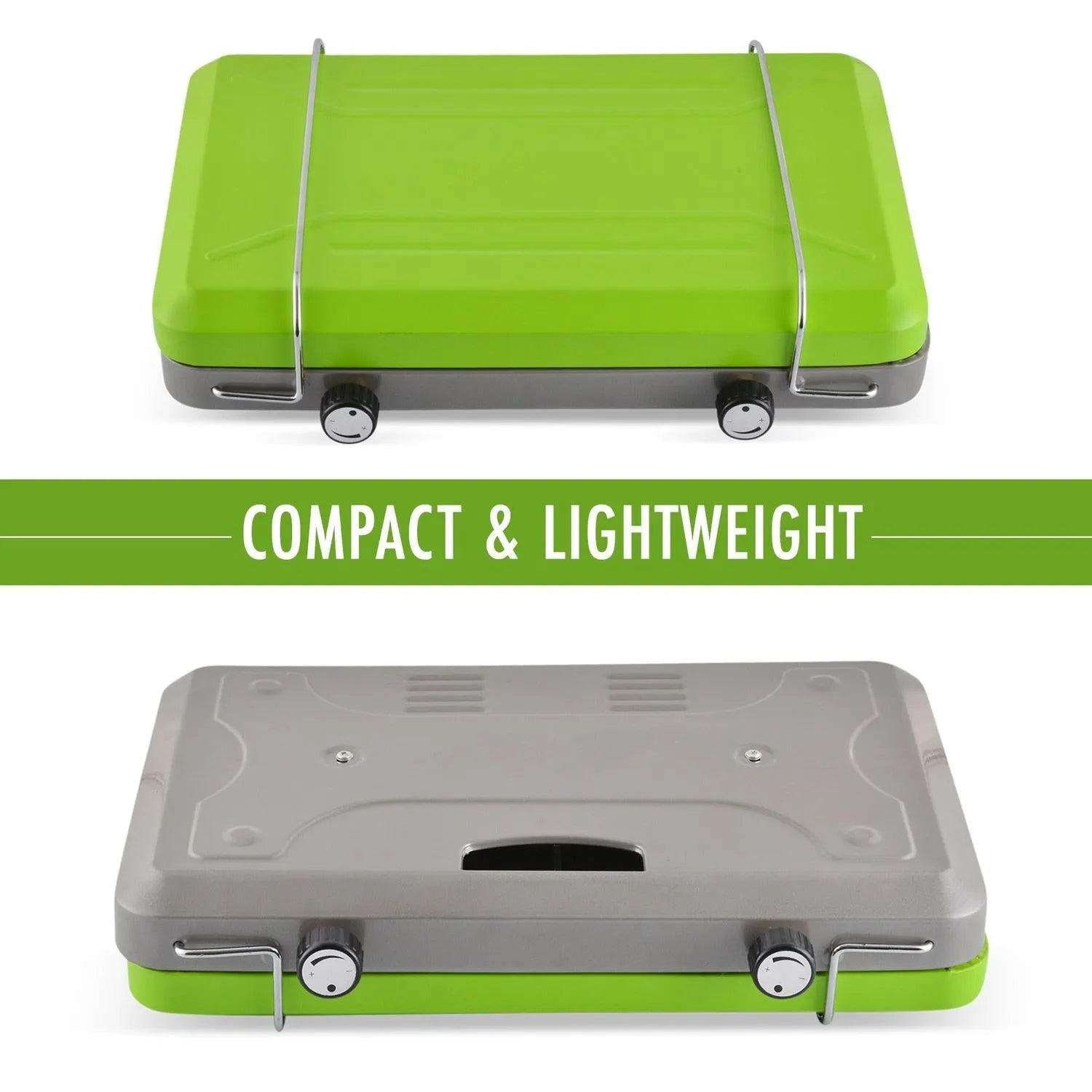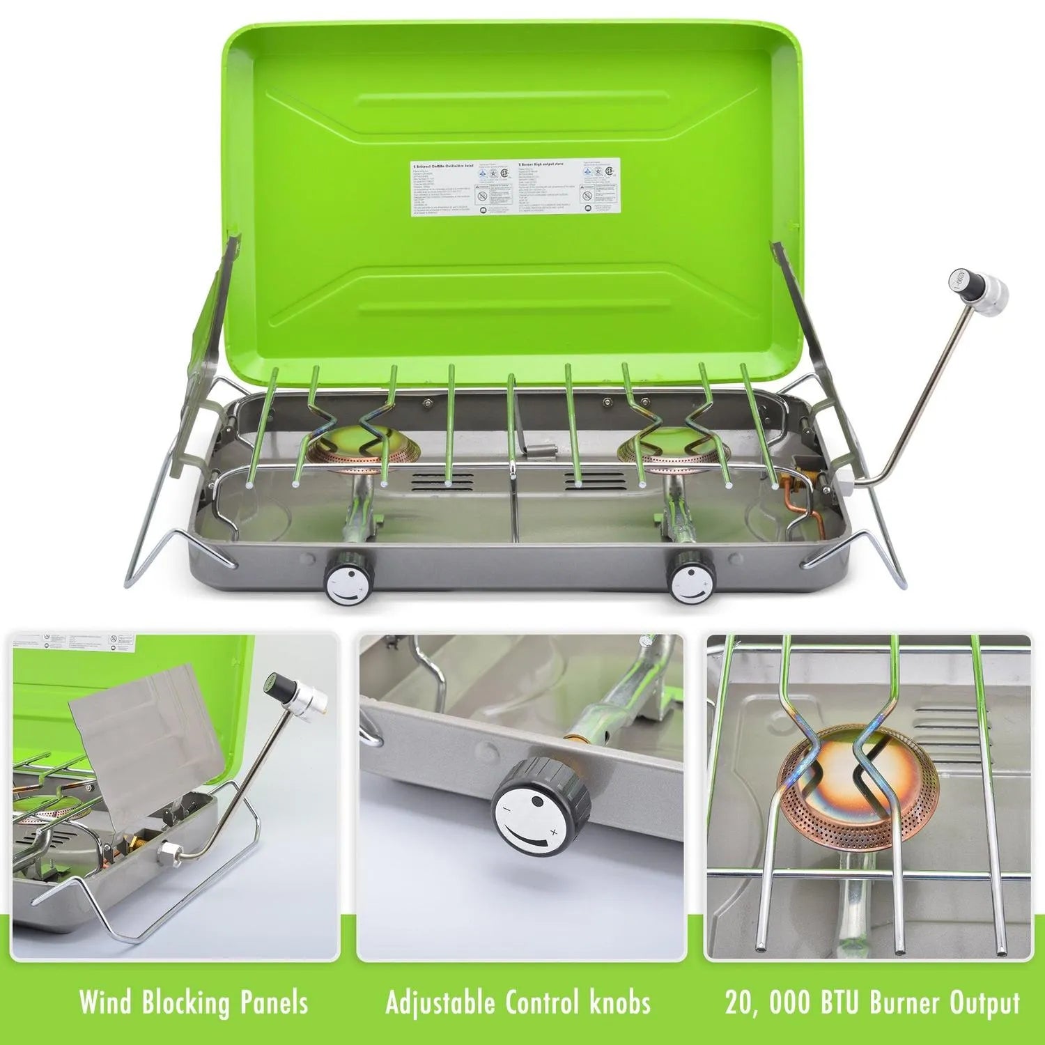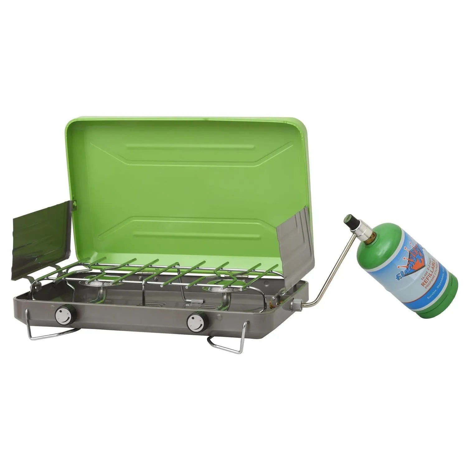 The 2-Burner Camping Stove from Flame King makes outdoor cooking fun and easy! It is designed for stable and efficient use and is perfect for backpacking, hiking, and camping trips. It is fueled by a 16. 4-ounce propane gas cylinder (not included). The 20, 000 BTU heat output is easy to control with an adjustable control knob so you can decide how high the flame should be. This versatile stove has 2 retractable legs that can be easily folded for compact packing and transport. Outdoor cooking just got a whole lot easier!