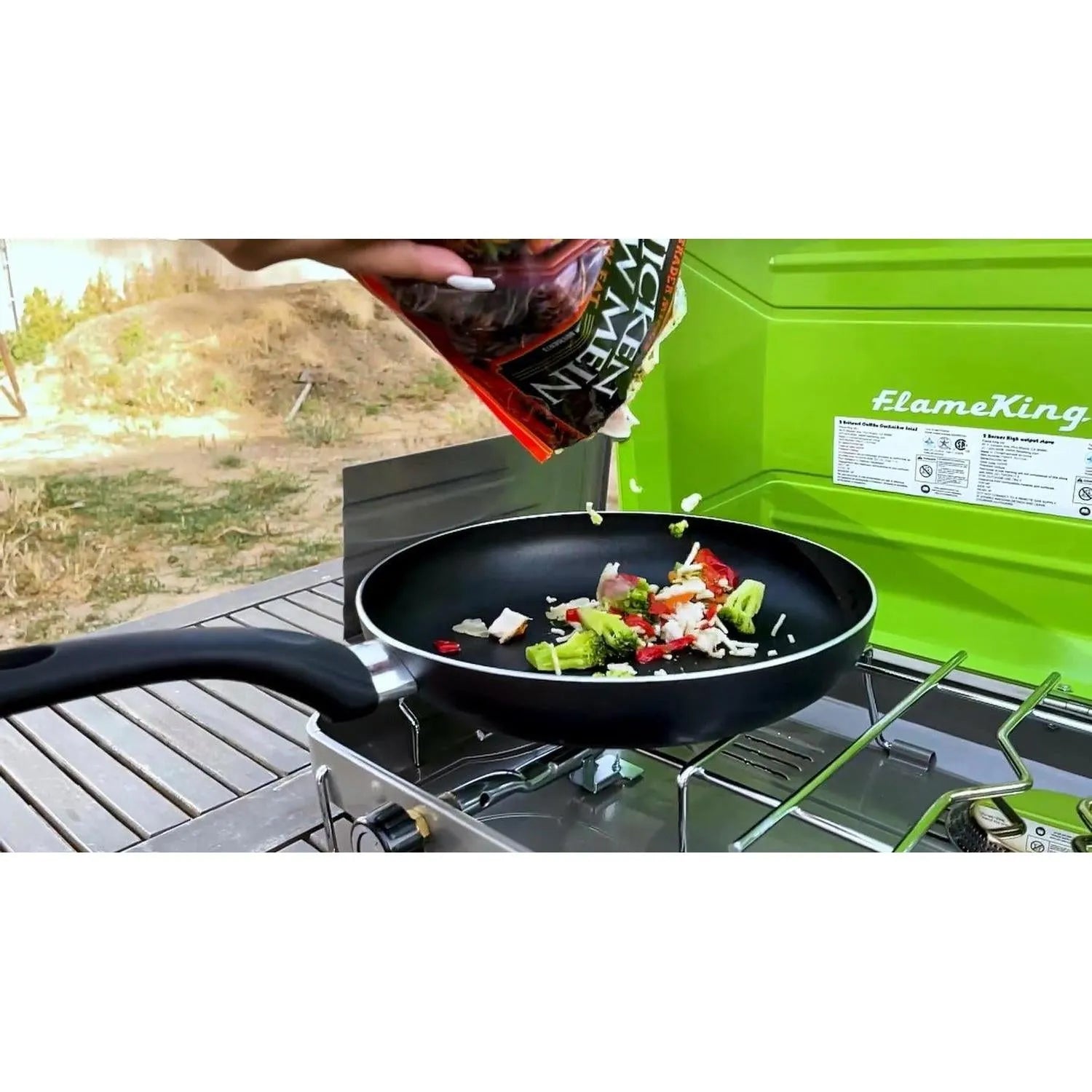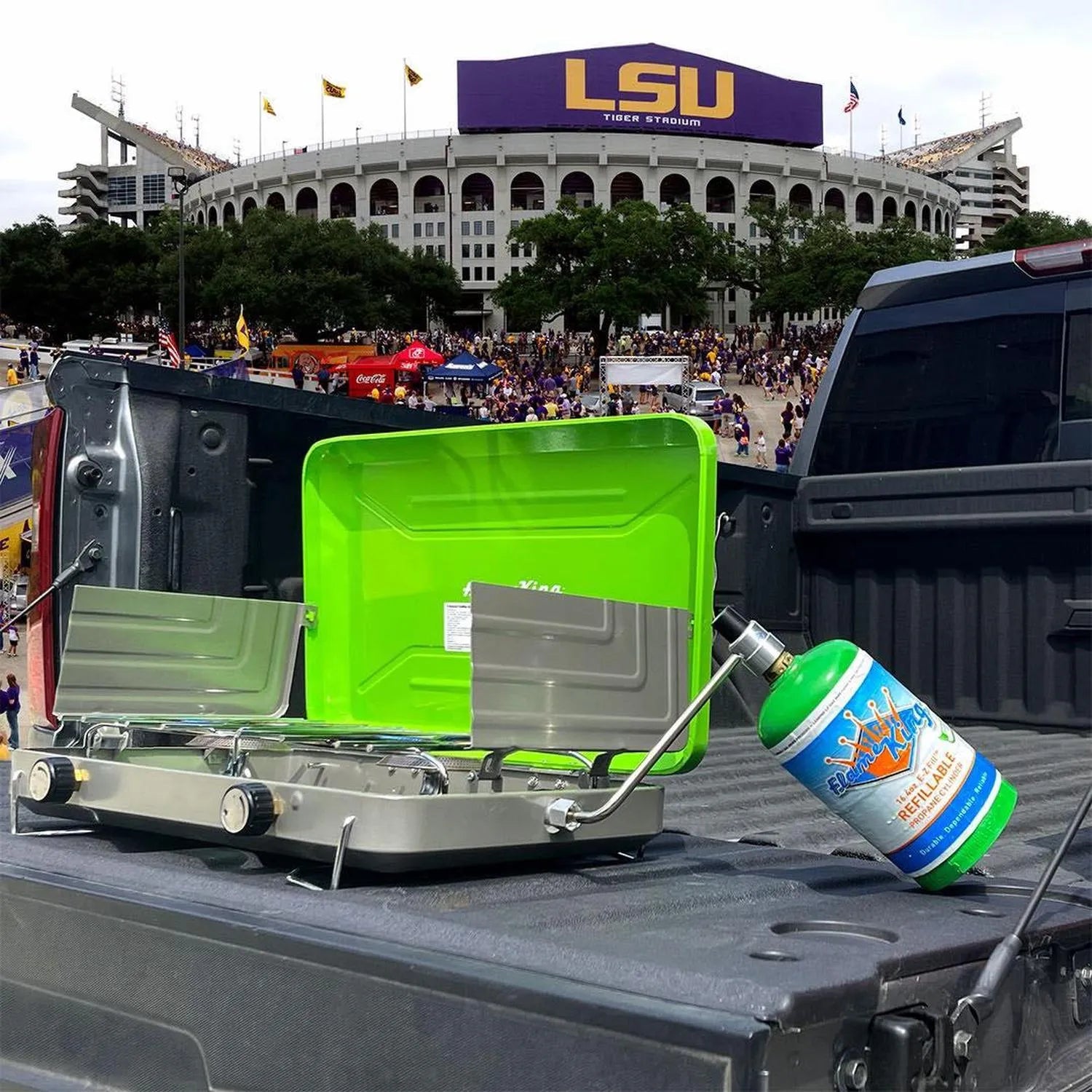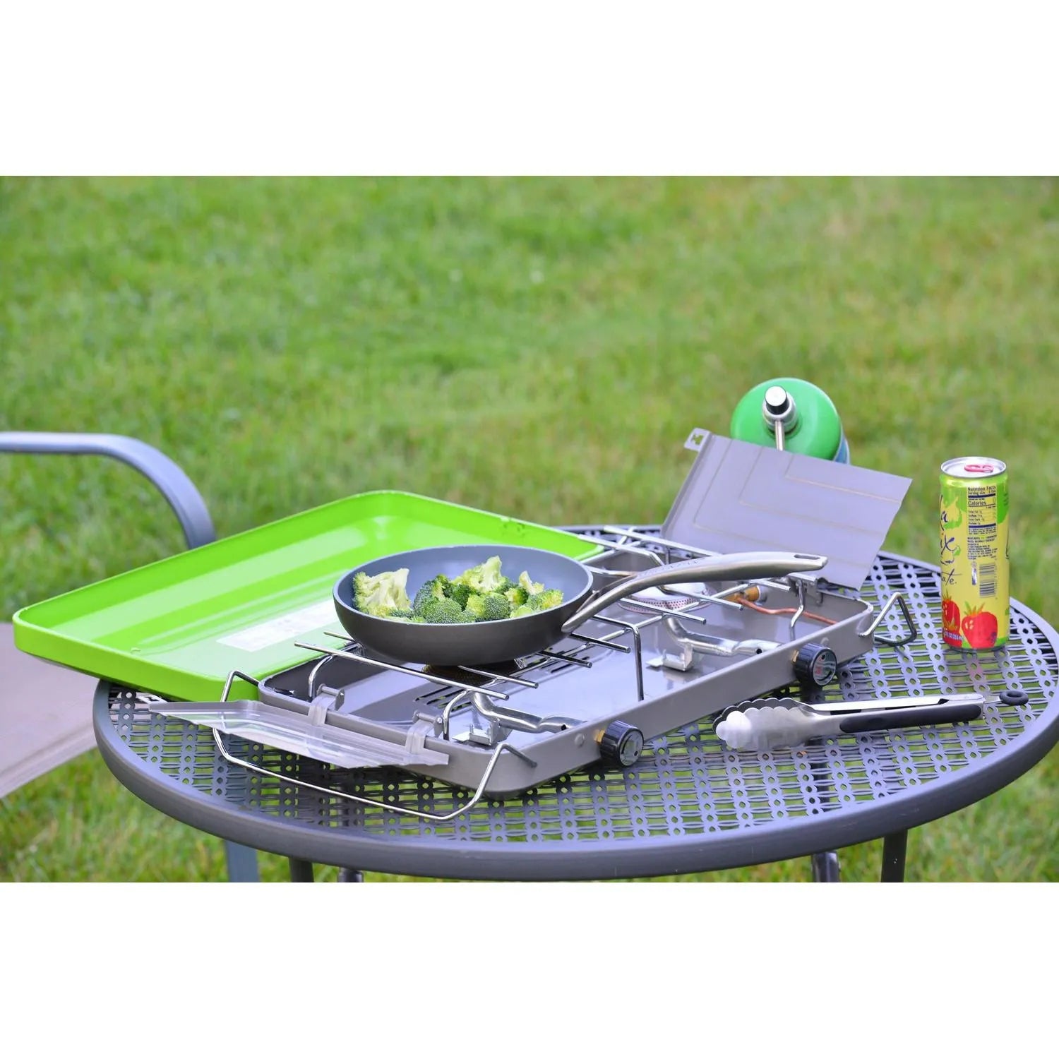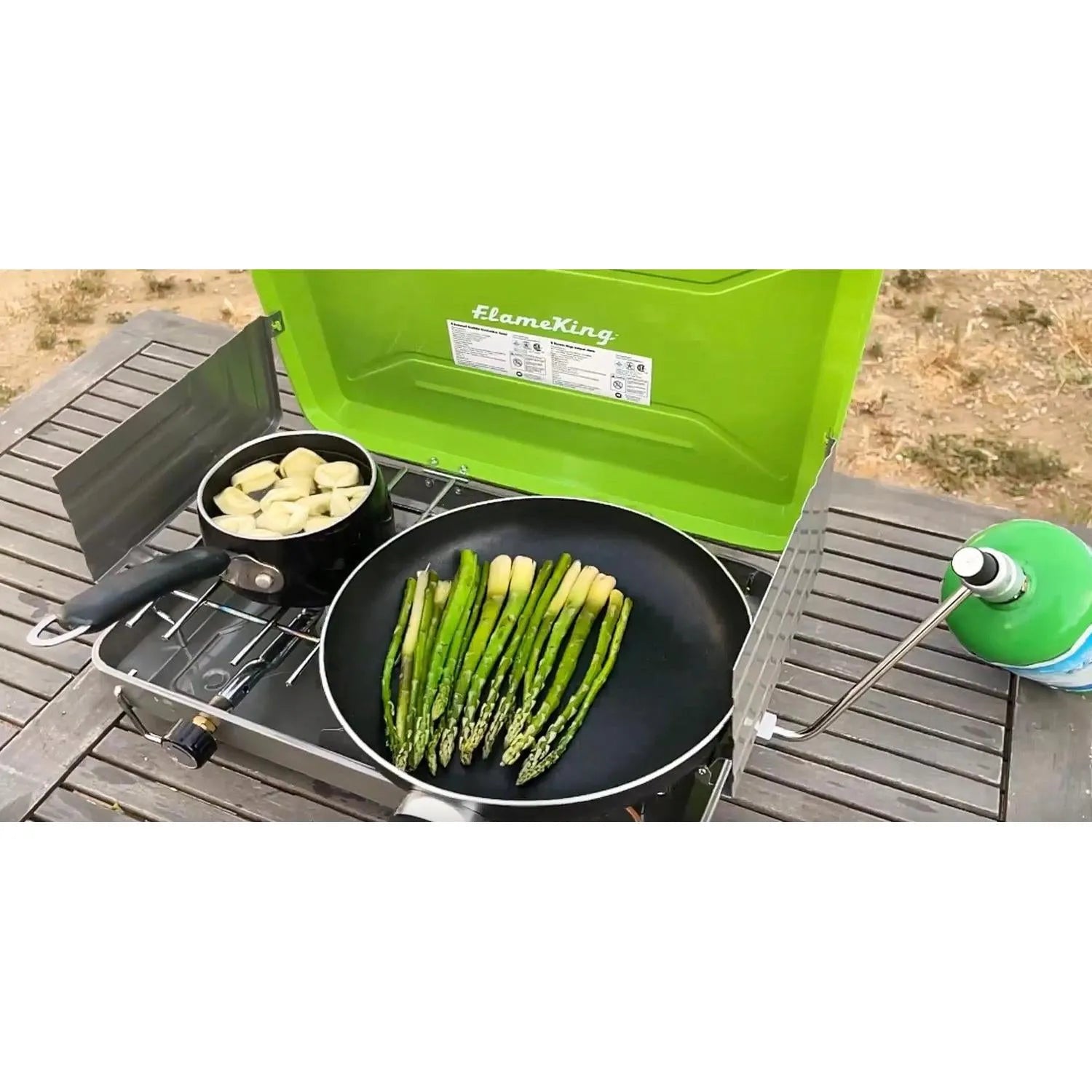 The 2-Burner Camping Stove from Flame King makes outdoor cooking fun and easy! It is designed for stable and efficient use and is perfect for backpacking, hiking, and camping trips. It is fueled by a 16. 4-ounce propane gas cylinder (not included). The 20, 000 BTU heat output is easy to control with an adjustable control knob so you can decide how high the flame should be. This versatile stove has 2 retractable legs that can be easily folded for compact packing and transport. Outdoor cooking just got a whole lot easier!