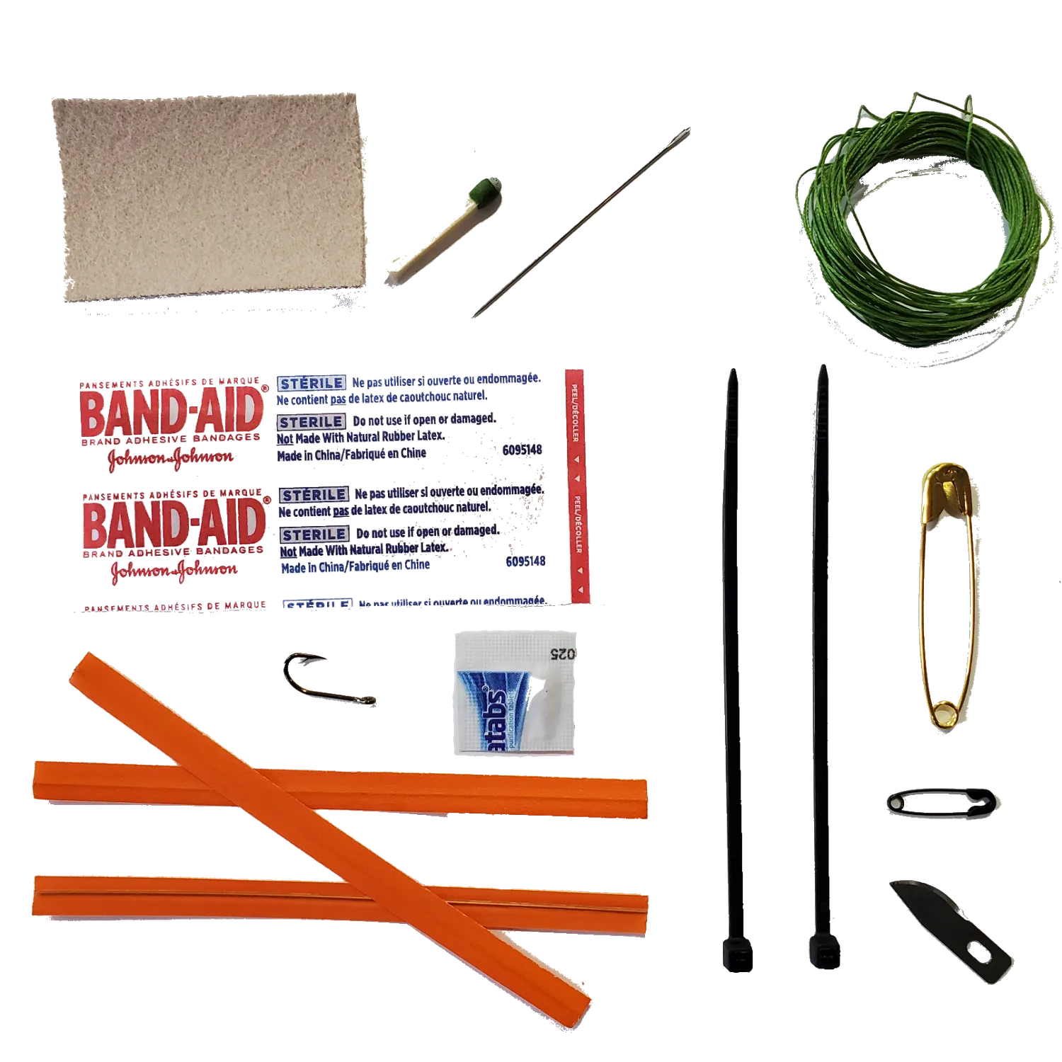 Quick-Access Tools – Fire starter ferro rod, ceramic striker blade, pealess whistle, ranger bands, P38 multi-tool, jute tinder, luminous compass, and Kevlar saw