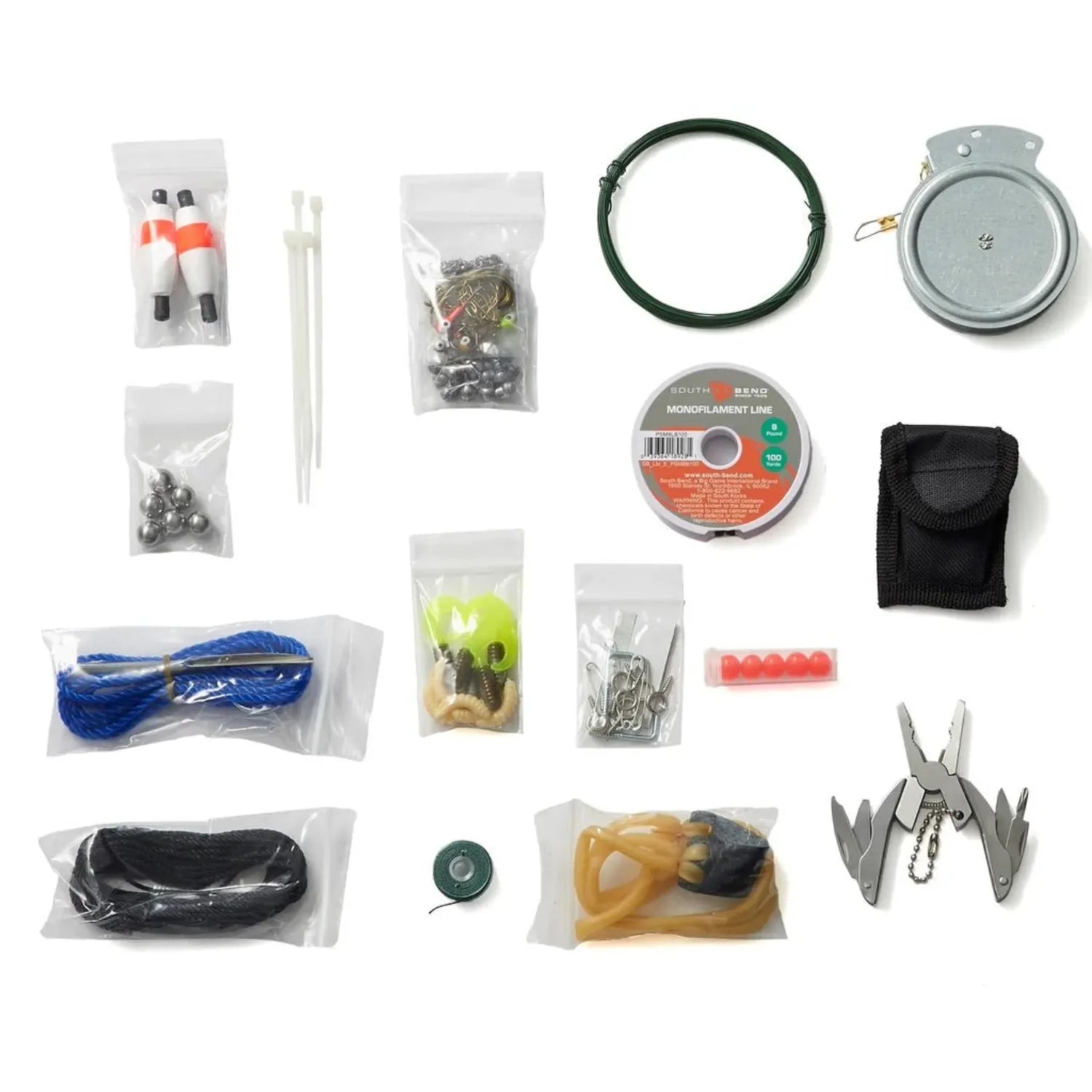 Fully Stocked for Survival – 127 items including hooks, lures, slingshot band, snare wire, fishing line, and more.