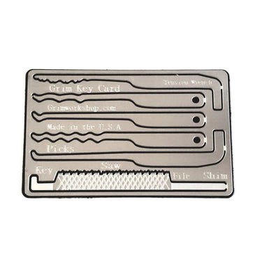 Built for overlanders, off-roaders, and preparedness-minded civilians, the Grim Key Card is a complete lock-picking and escape toolset packed into a stainless steel card the size of a credit card. Whether you're accessing locked gear boxes, dealing with a vehicle lockout, or performing emergency egress, this tool ensures you're never caught without a backup plan.