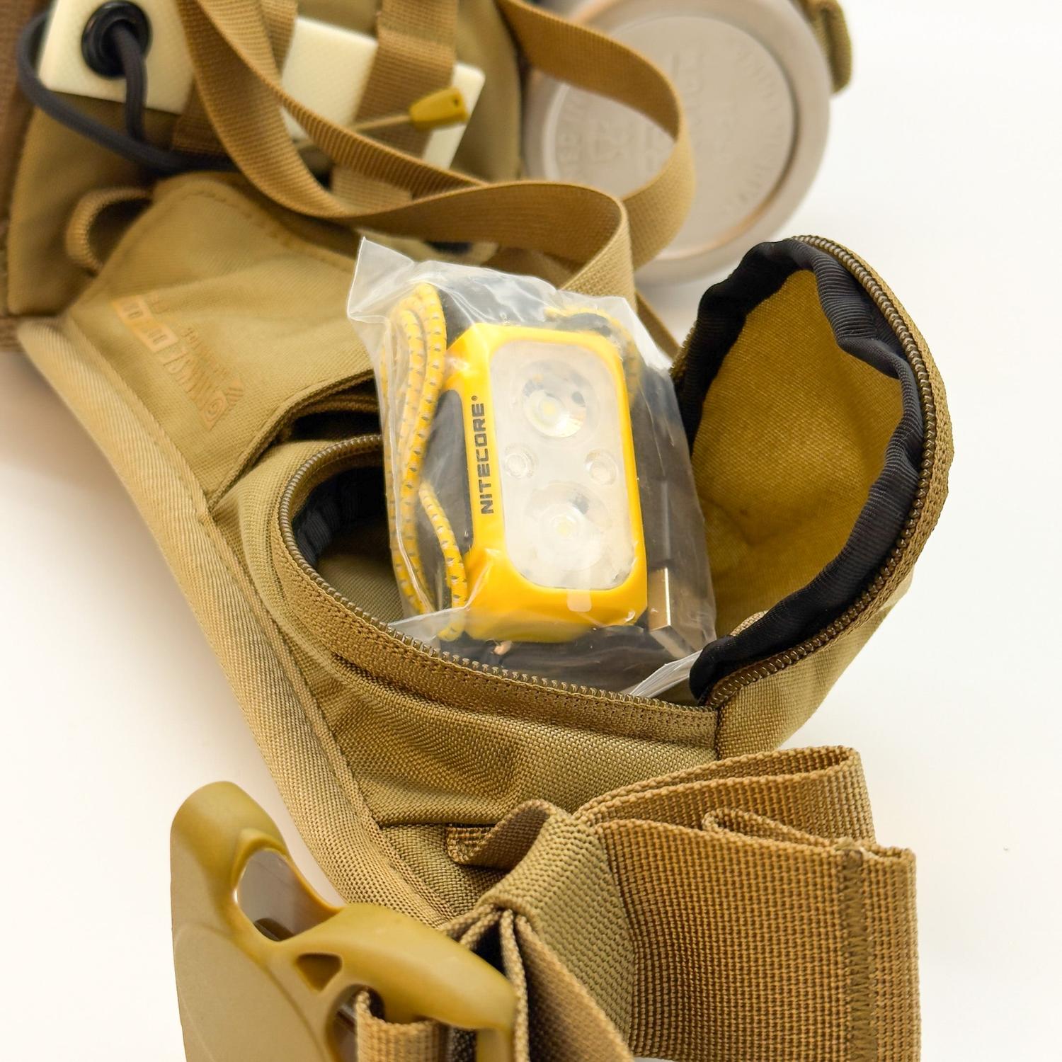 A discreet survival kit staged in the GRAYL Mission EXP Hip Pack, focused on hydration and essential tools for the first 72 hours.