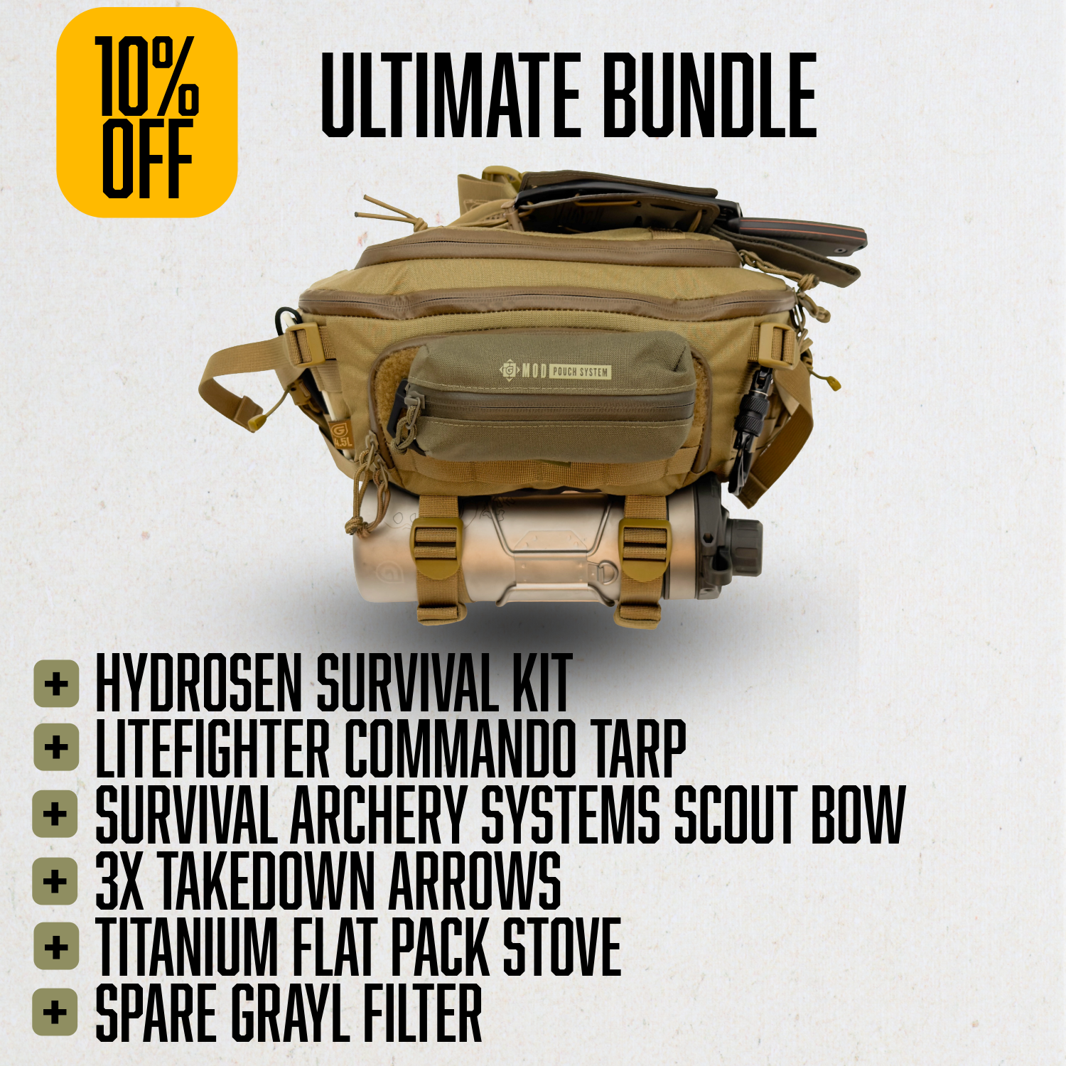 A: The Ultimate Bundle expands the hydration-first platform into a full survival system—adding shelter, cook, and food procurement capability while keeping the same discreet footprint.
