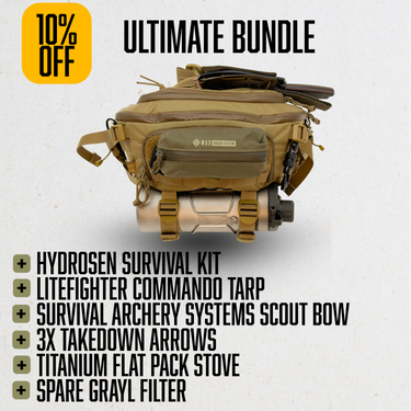Water decides survival. The HYDROSEN Ultimate Survival Bundle is a Black Friday exclusive built for professionals who understand that hydration comes first—but redundancy keeps you alive. Based on the proven HYDROSEN system and staged in the GRAYL Mission EXP Hip Pack, this loadout integrates clean water capability, fire and shelter systems, a takedown bow for food procurement, and a full cook set—all in one compact, field-ready package.