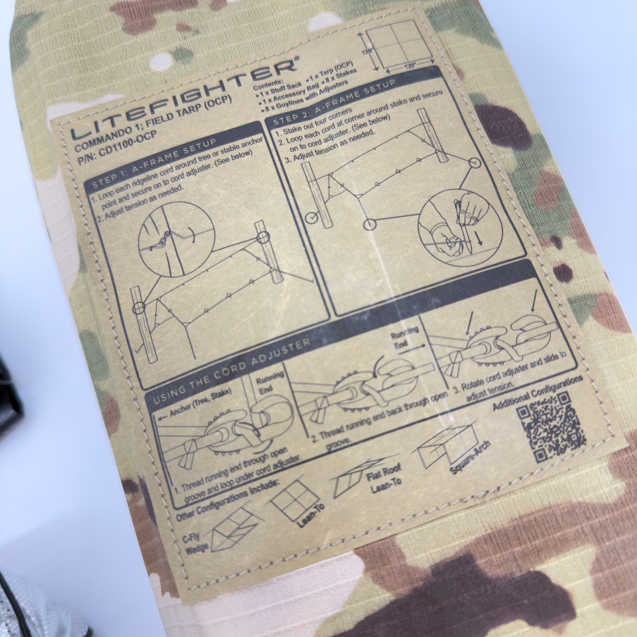 - LiteFighter Commando Tarp Shelter – Primary tarp shelter system for overhead cover, windbreak, and precipitation protection.