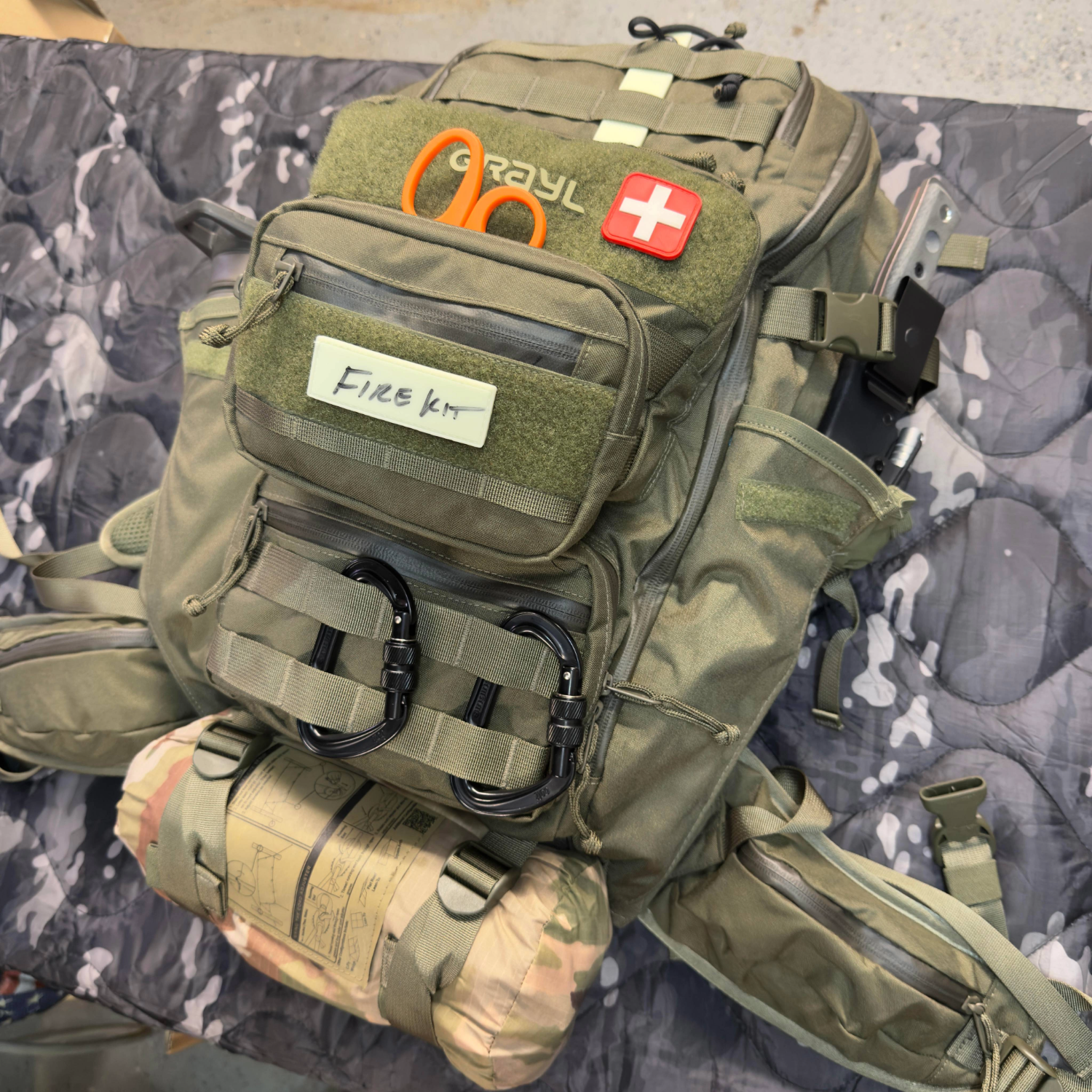 Fire Kit – packed in GRAYL G-MOD Flat Pouch and labeled with one FindMe glow tag patch