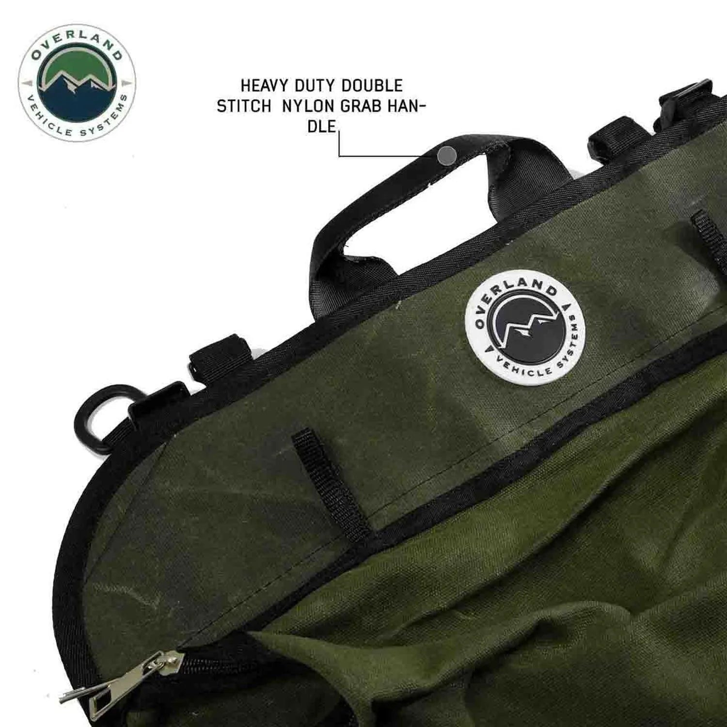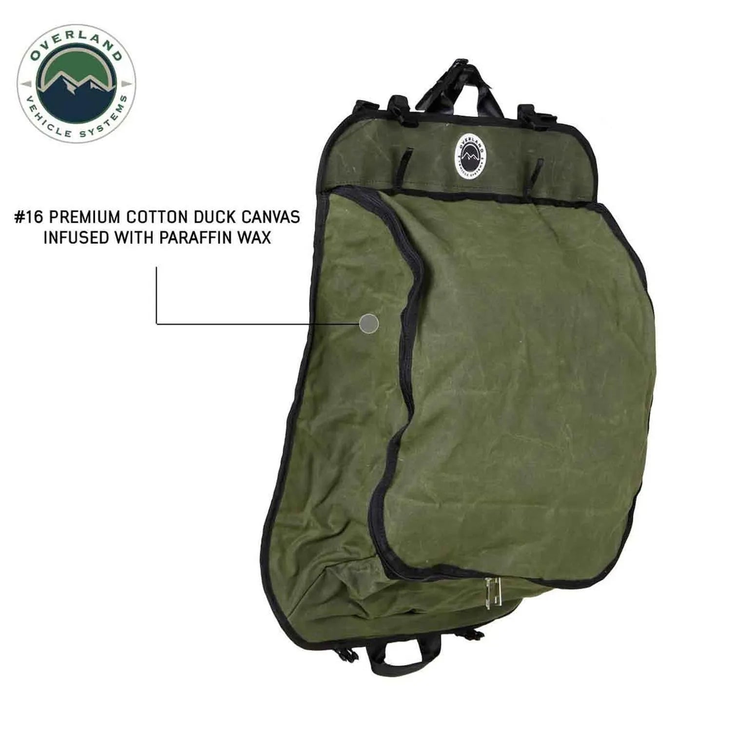 The Overland Vehicle Systems Canyon Waxed Canvas Camping Gear Storage Bag keeps your essentials organized, protected, and ready at a moment’s notice. Constructed from #16 waxed cotton duck canvas with reinforced stitching and heavy-duty hardware, this bag is engineered to perform in demanding conditions while developing a classic patina over time.