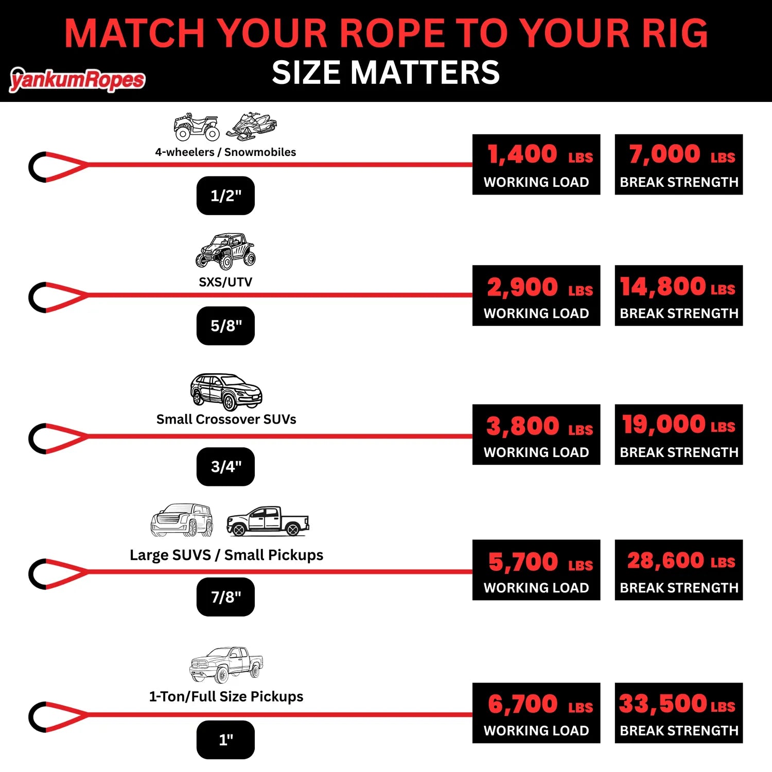 A: It’s ideal for ATVs, quads, and small utility vehicles up to about 1,500 lb. Always size your rope to the recovery vehicle’s weight, not the stuck one.