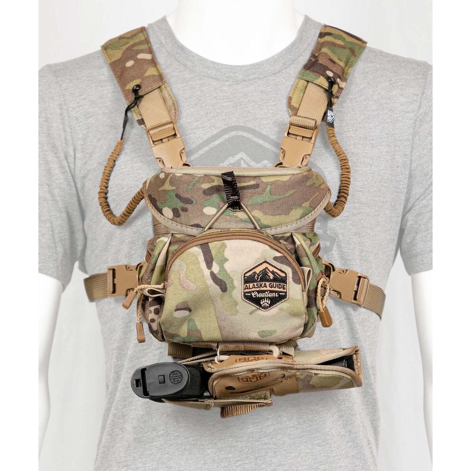 The Alaska Guide Creations XL Holster is the big brother to our popular holster and is designed to fit most full size autos and revolvers. Like it's little brother, it gives you easy access to your sidearm while providing the flexibility to strap it to almost any piece of gear. It's fitted with a custom laser cut 500D nylon connection panel that allows the Holster to be used in a right or left handed fashion. Two (2) 50mm gate keepers are included that allow it to be connected vertically or horizontally to the bottom of the Ravus and Gen L Bino Packs. It can also attach vertically to either side of all AGC Bino Packs, and to most any other chest harness, backpack, or everyday belt.