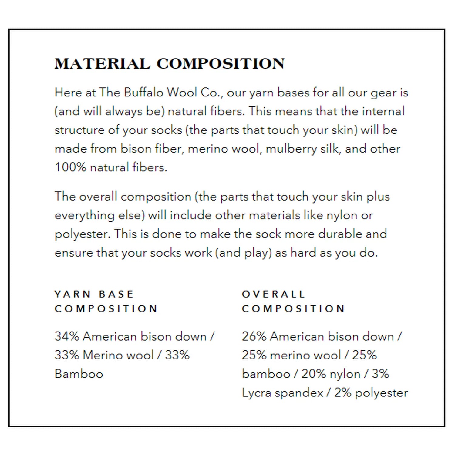• Ultralight, moisture-wicking bison/wool/bamboo blend