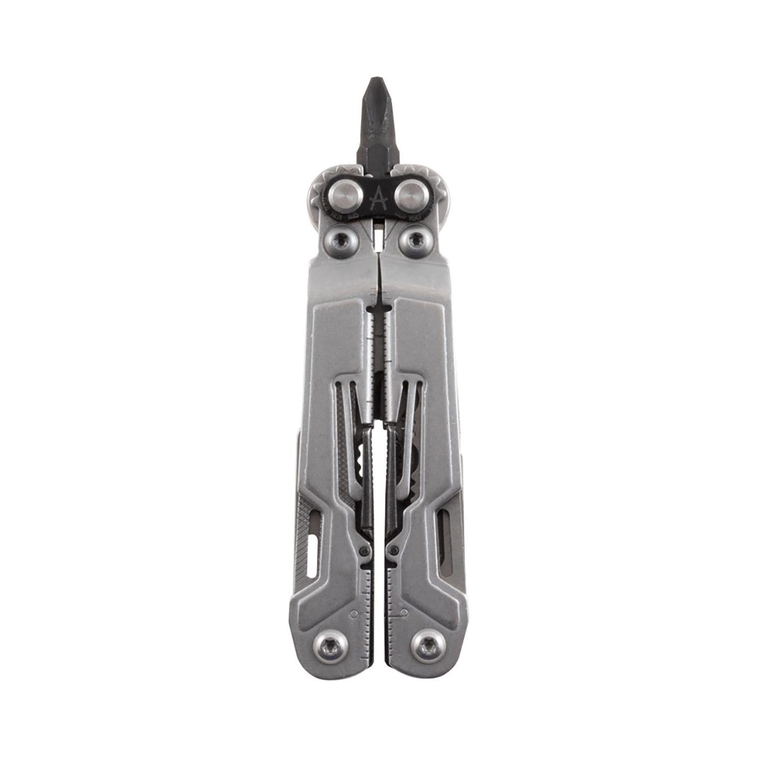 18 Locking Tools – Pliers, wire cutters, dual blades, scissors, drivers, rulers, awl, file, openers, and more in one compact platform.