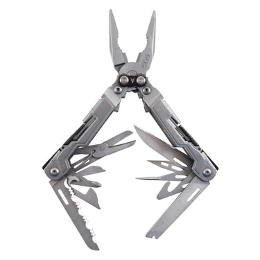 Includes: Compound leverage pliers, hard/soft wire cutters, straight & serrated blades, magnetic bit driver, file, scissors, awl, rulers, can & bottle openers, line cutter, jewelry driver, flat & Phillips drivers.
