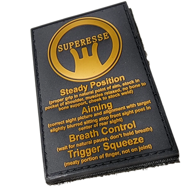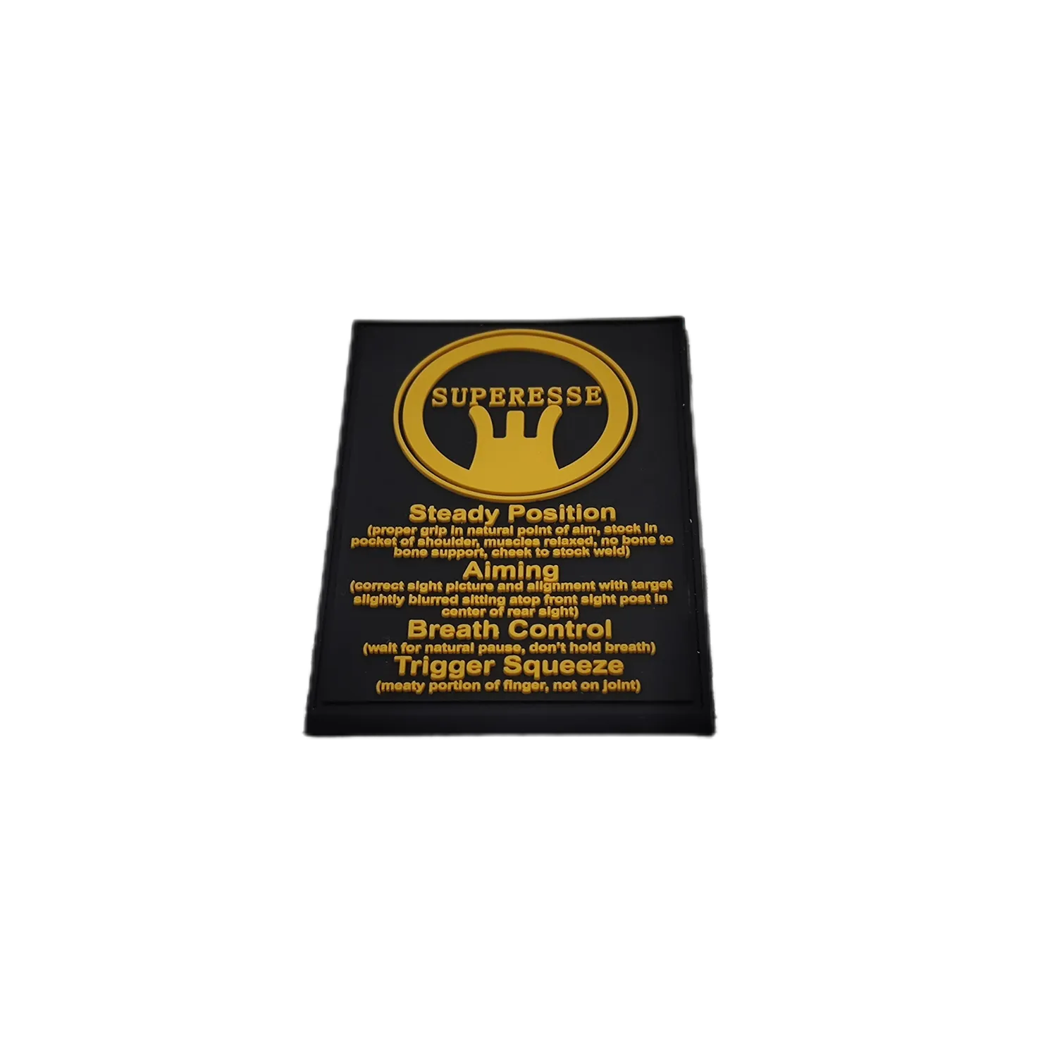 A reminder of the key elements of preliminary marksmanship instruction; Steady position, Aiming Breath control, and Trigger squeeze. Great for range days or training facilities. Store a front sight adjuster tool (nail) or CLP in the rear of the patch. The four fundamentals are found in FM 3-22.9. PVC Oversized with large entry storage slot.