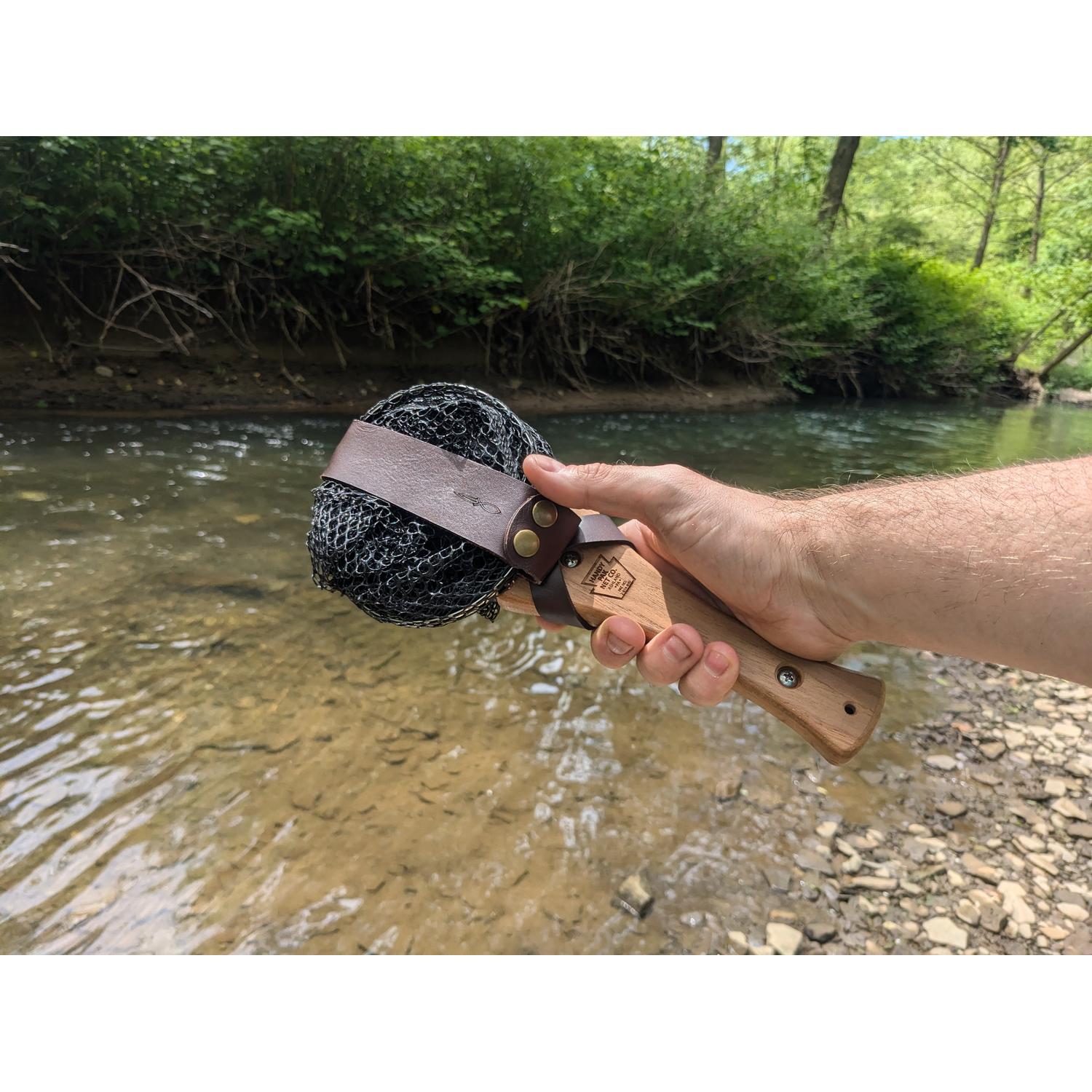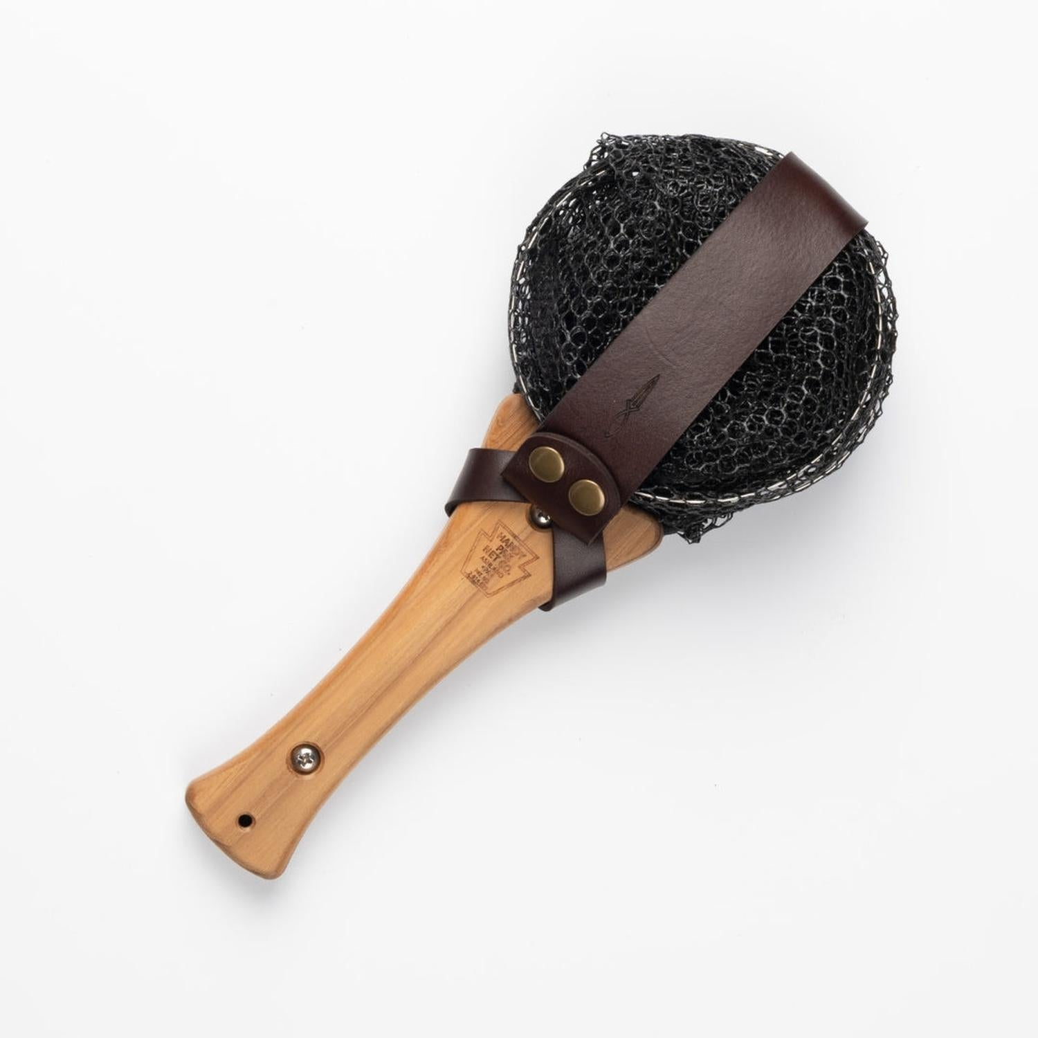 Materials: Full-grain vegetable-tanned leather, brass snaps, teak wood handle, knotless rubber netting, stainless spring steel frame